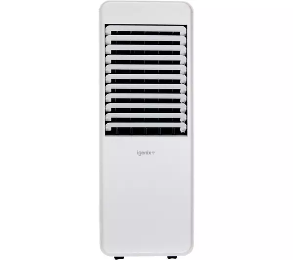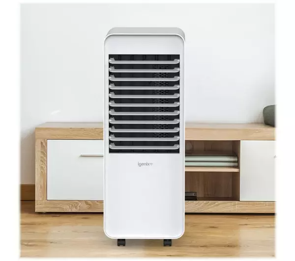 Cool your home effectively using this 10 Litre Smart Air Cooler from Igenix, which has an easy-fill removable water tank and includes ice packs for enhanced cooling performance. For ultimate convenience, this air cooler comes equipped with a remote control, as well as Wi-Fi functionality. Use your mobile device to control the appliance from anywhere, or control via voice commands, with Amazon Alexa and Google Assistant compatibility. Use the 8-hour timer to turn the unit on or off at a desired time in the future, perfect for busy households and for saving energy. 120° horizontal oscillation efficiently distributes the cool air around the room, and the 45° manually adjustable vertical louvres enable you to direct the air where you need it most. With built-in castor wheels, this air cooler can be easily moved from room to room with you, so you can stay cool wherever you are in the house.