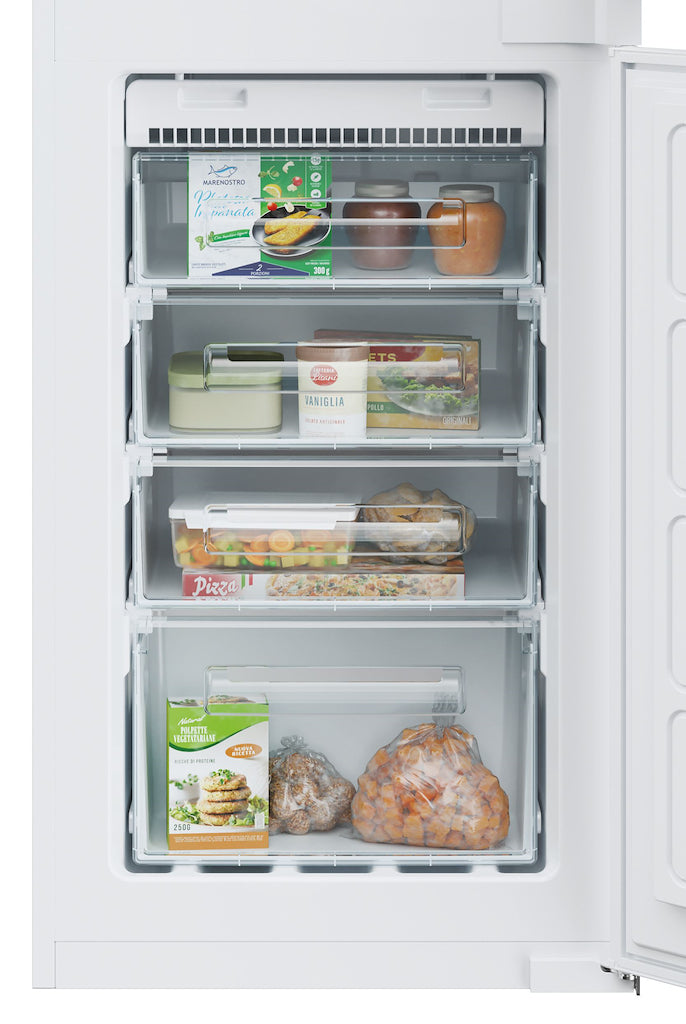 Combined refrigerator with the fridge on top and the freezer at the bottom. With 55cm in width, it is a smart solution to store your food depending on your daily needs.