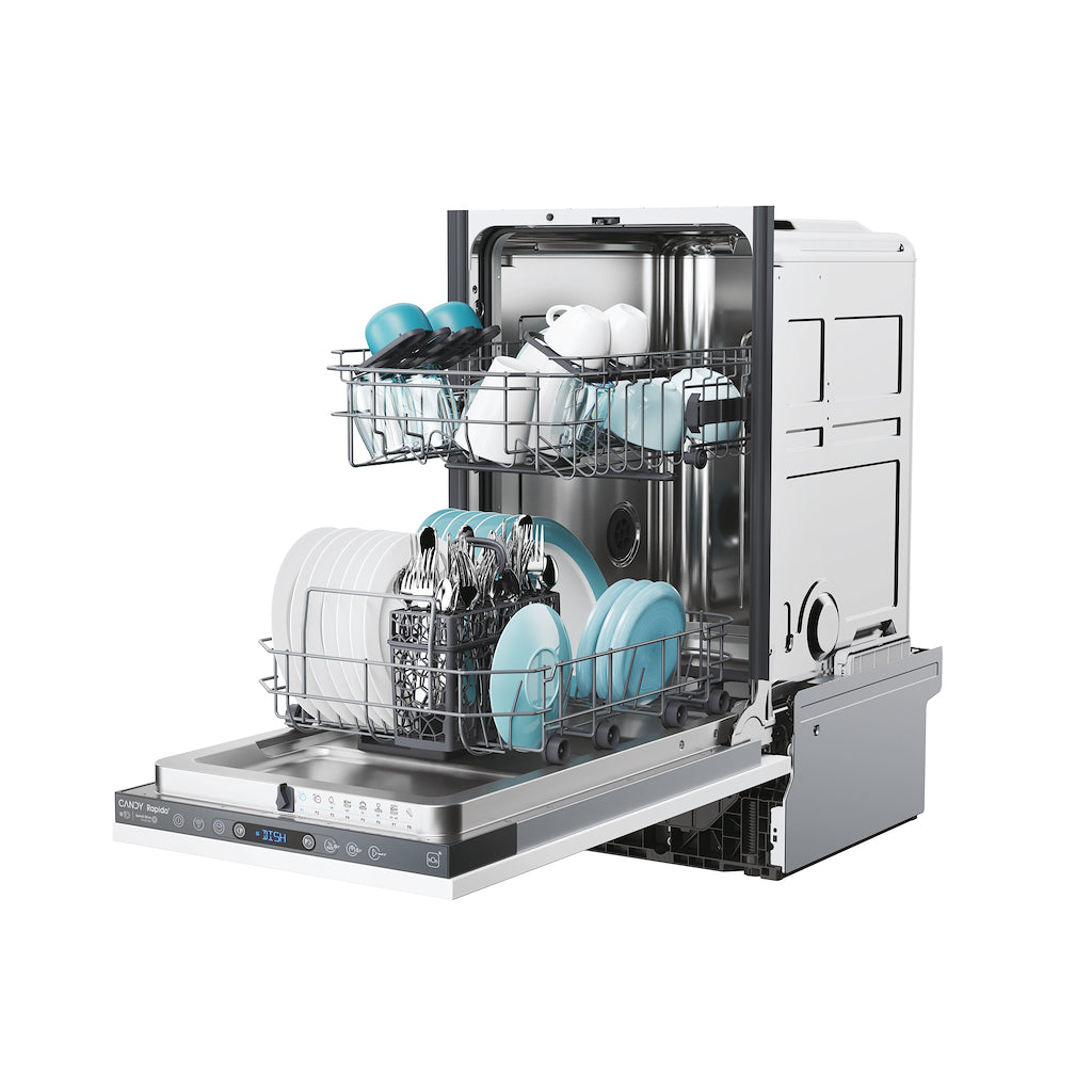 Experience the enhanced Candy Rapido', now in a compact 45cm size, with heightened speed and intelligence. Its quick cycles package, innovative functional design, and complete connectivity work in harmony to simplify your daily life, while saving time and money. In just 35 minutes, RapidÓ efficiently cleans and dries all your dishes, thanks to the new brushless Inverter Motor that ensures an Energy Class up to C. Don't miss the opportunity to receive adivces on how to optimize the loading and discovering the most efficient cycles through the hOn app.