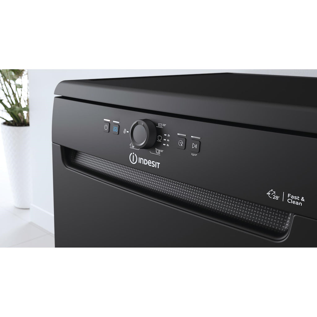 This Indesit Dishwasher features: full size dishwasher with an outstanding number of available place settings. Outstanding A++ energy rating, for reduced energy consumption. Exceptional, reduced water consumption. Black colour. Adjustable feet, for perfect stability on uneven floors and surfaces.