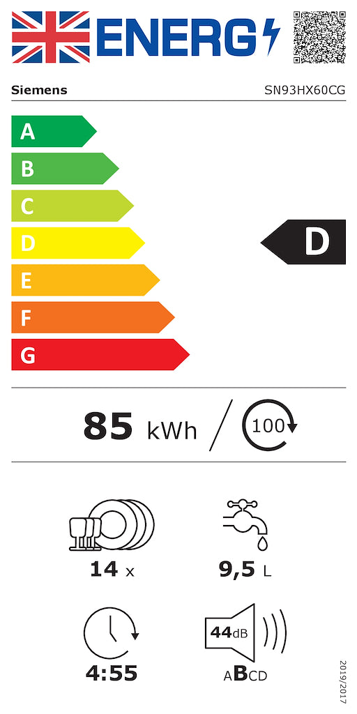 varioHinge 50mmNew for 2021Performance Energy Efficiency Class¹: D Energy² / Water³: 85 kWh / 9.5 litres Capacity: 14 place settings Programme duration⁴: 4:55 (h:min) Noise level: 44 dB(A) re 1 pW Noise Efficiency Class: B Programmes/functions...Regular price POA -