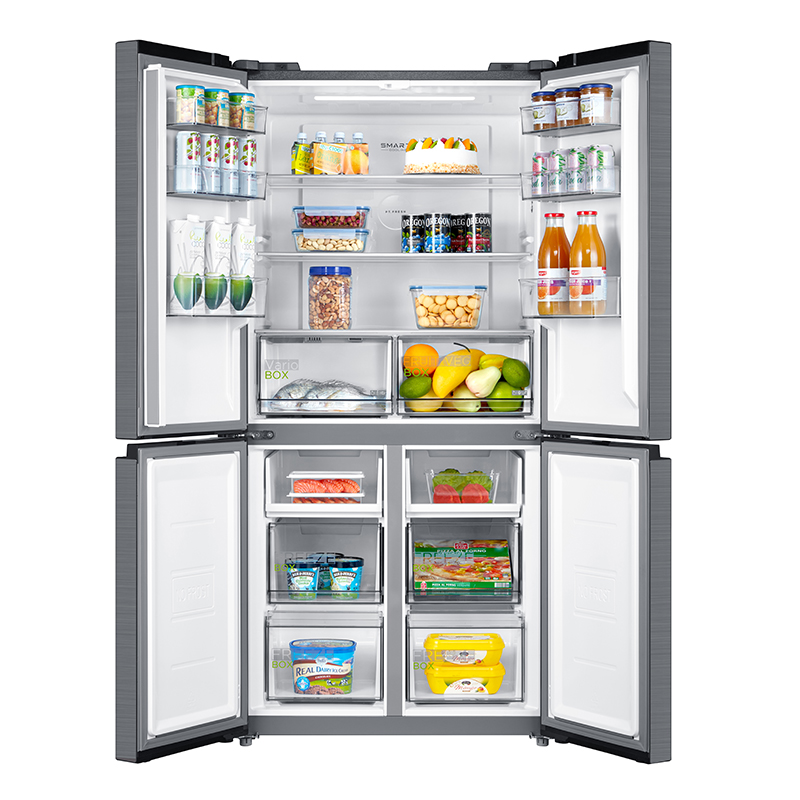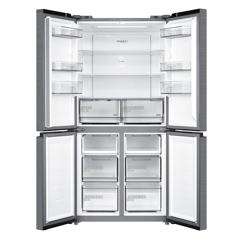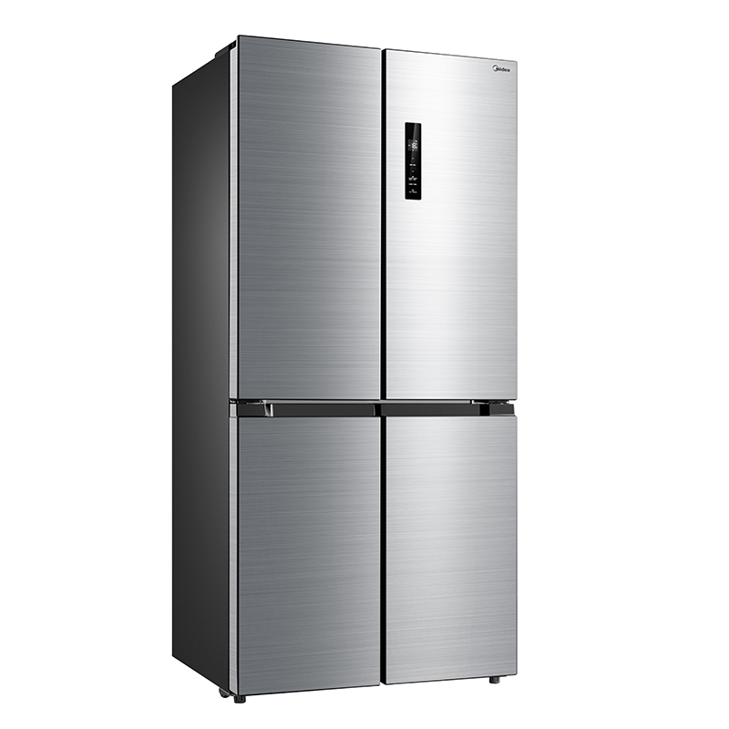 This Midea Multi Door Fridge Freezer Inox, designed for T/ST/N/SN climate conditions and with an E energy rating, offers an expansive net capacity of 474L (305L for refrigeration, 169L for freezing) in a sizeable 833×653×1775mm frame. It features Super Freezing and Super Cooling functions for rapid temperature adjustments, ensuring optimal food preservation. The 90° door open feature provides easy access, even in tight spaces. Total No Frost technology eliminates the need for manual defrosting, while Dual Electronic Touch Control allows for precise temperature management. The Multi Air Flow system ensures even cooling throughout, and the Platinum Fresh energy can effectively remove the odor and ensure a fresh interior. It includes a Separate Electronic Temperature Control for the crisper, ensuring fruits and vegetables are stored at ideal conditions. The Vario Box offer flexible storage solutions, and the Inverter Compressor operates efficiently, reducing energy consumption. This Midea Multi Door Fridge Freezer is distinguished by its Midea exclusive Stainless-Steel panel, adding a touch of elegance to its practical design, making it a perfect fit for modern kitchens seeking efficiency and style.