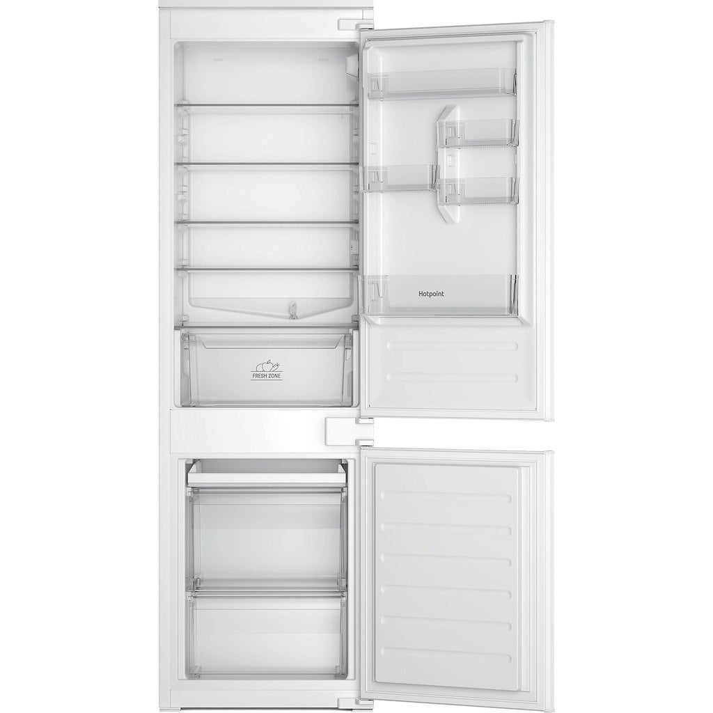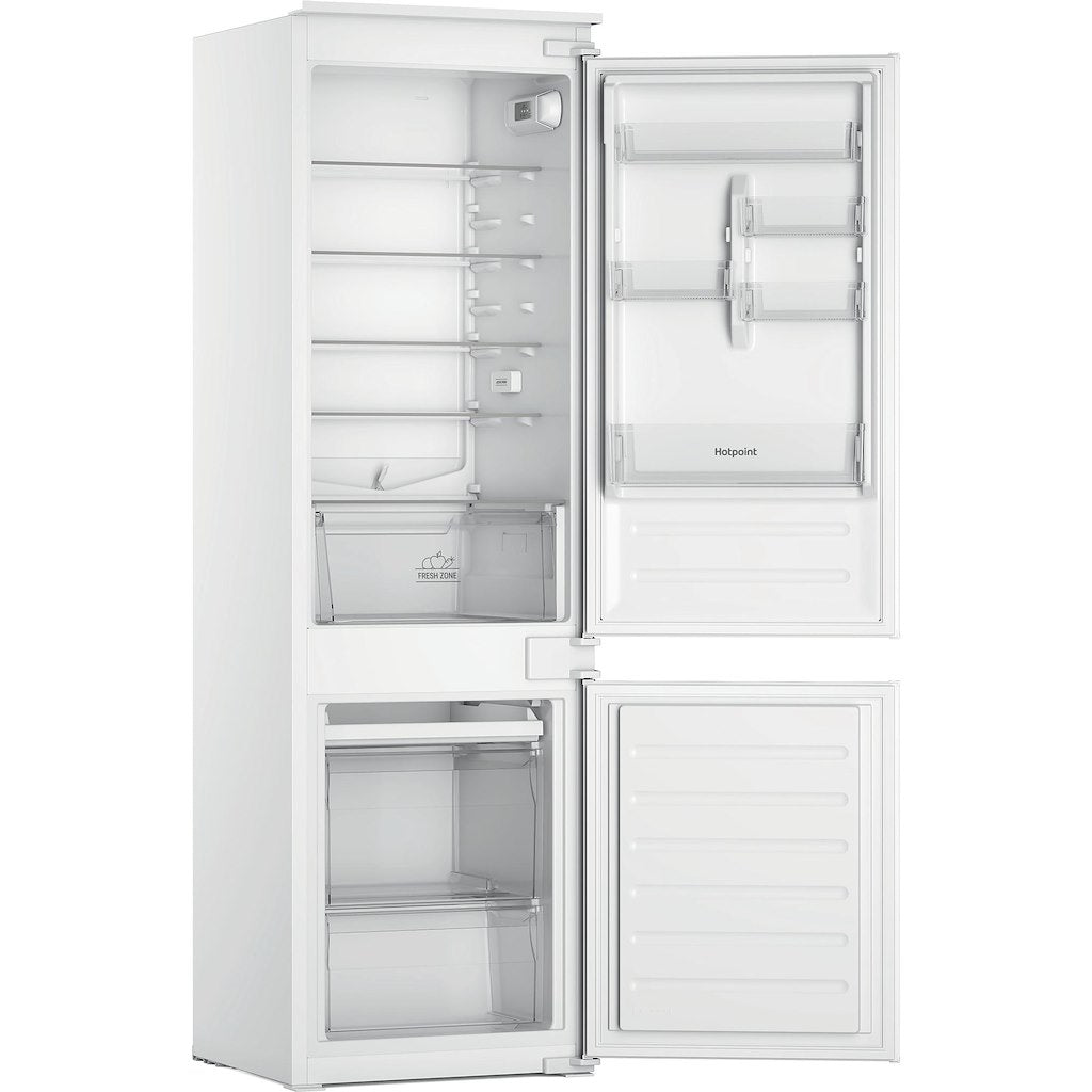 This Hotpoint built-in fridge freezer offers a 70/30 split of fridge and freezer space and includes thoughtful technology that's focussed on keeping your food fresh and reducing waste. Blending seamlessly into your kitchen design, this fridge freezer has a large capacity of 273L, which is ample space for 15 shopping bags worth of groceries - perfect for a large weekly shop. A sleek exterior display allows you to control temperature levels at the touch of a button and our Fast Freeze function quickly freezes food when you return home with groceries, intelligently dropping the temperature to help maintain the freshness of your food. A helpful fridge door alarm will also let you know if it's been accidentally left open, preventing any mishaps. Our handy Low Frost technology reduces ice build-up, so you won't need to defrost as often, and our Fresh Zone drawer maintains the correct temperature to keep salads crisp and vegetables fresh for longer. Adjustable shelves and door storage also offer added flexibility, while the bright LED light illuminates the interior of your fridge so you can see everything clearly.