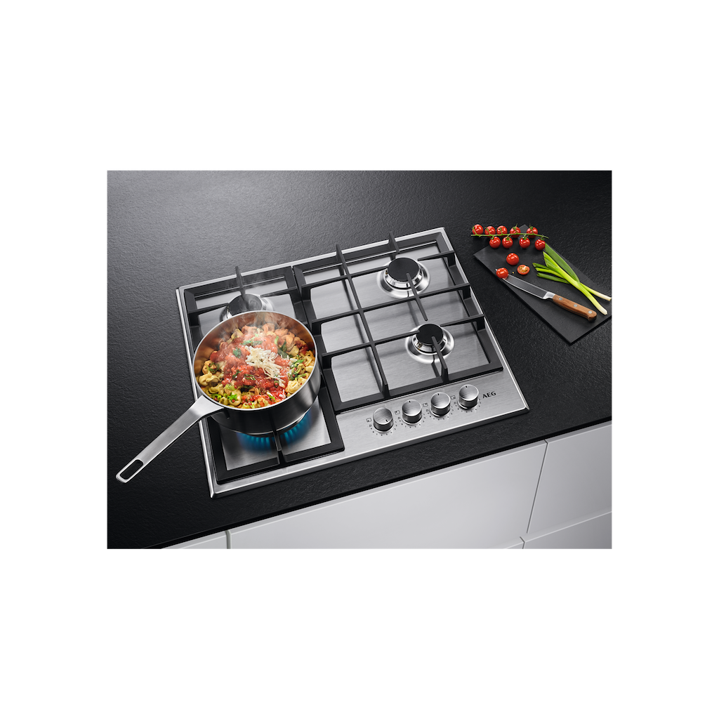The controls on the gas hob are positioned at the front, so they can be accessed directly, providing maximal control of the cooking process.