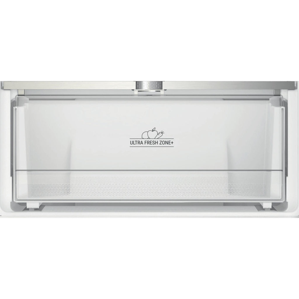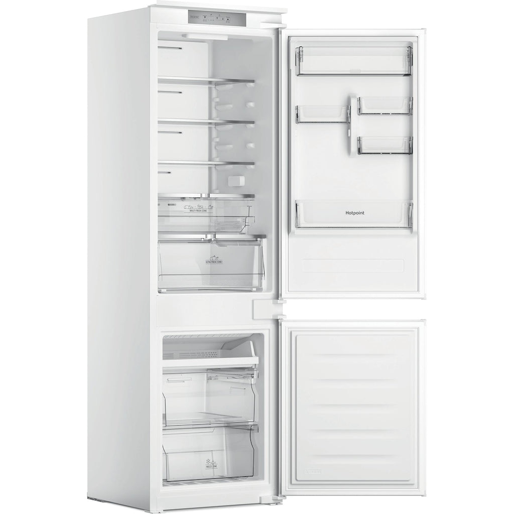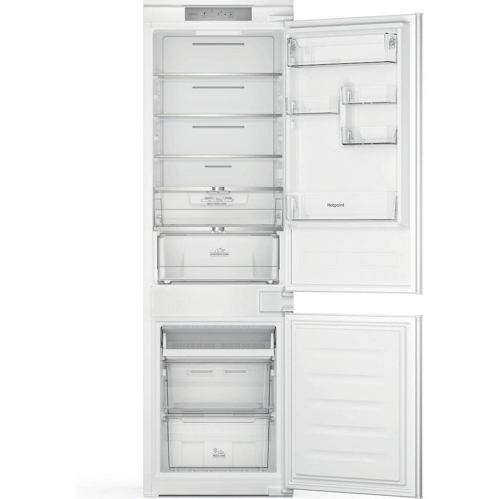 This built-in Hotpoint Total No Frost Fridge Freezer blends seamlessly into your kitchen design and is full of thoughtful technology that will take care of your fresh and frozen food, helping you to reduce your food waste at home. Total No Frost technology consistently circulates air around both the fridge and freezer, so ice and moisture can't build up. It means you won't be left with soggy salads or have to defrost your appliance ever again. Food temperature is kept stable thanks to MultiCool Flow, which evenly distributes cool air inside the fridge and freezer to give a constant and uniform flow of air. With ActiveFresh, electronic controls constantly monitor the temperature inside your fridge and freezer and quickly restore the right temperature when the door has been open for a while. Inside the fridge, you'll find a sealed Ultra Fresh Zone+ drawer with a handy humidity control so you can easily choose the ideal setting to keep your fruit, vegetables or both fresh for up to 2 weeks*. The Fast Freeze function also allows you to quickly freeze your groceries, rapidly dropping the temperature of the freezer to help maintain the freshness of your food. It's quiet too. At just 34dB(A) this fridge freezer goes unnoticed, working quietly in the background. *Based on weight loss and visual quality, considering common fruits and vegetables. Internal test procedure.