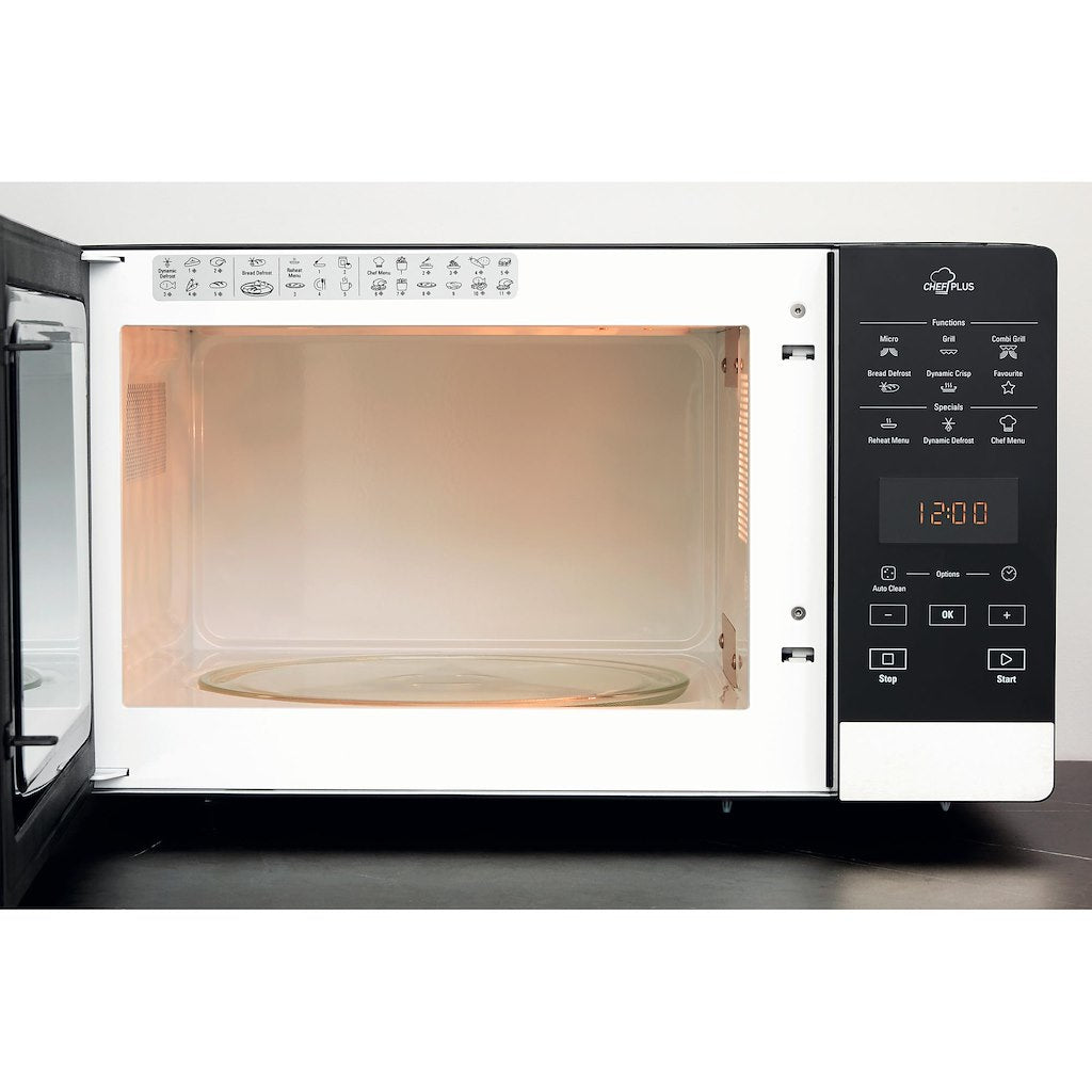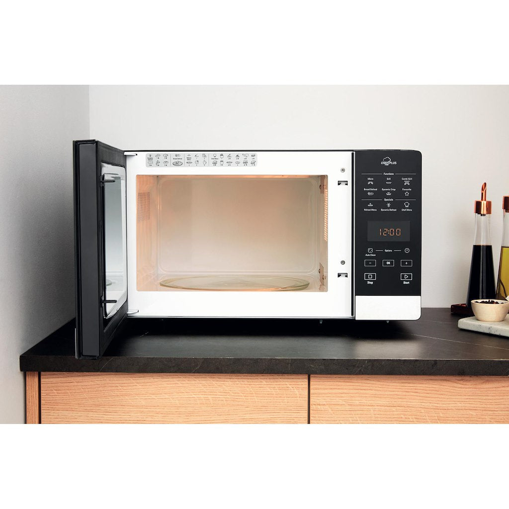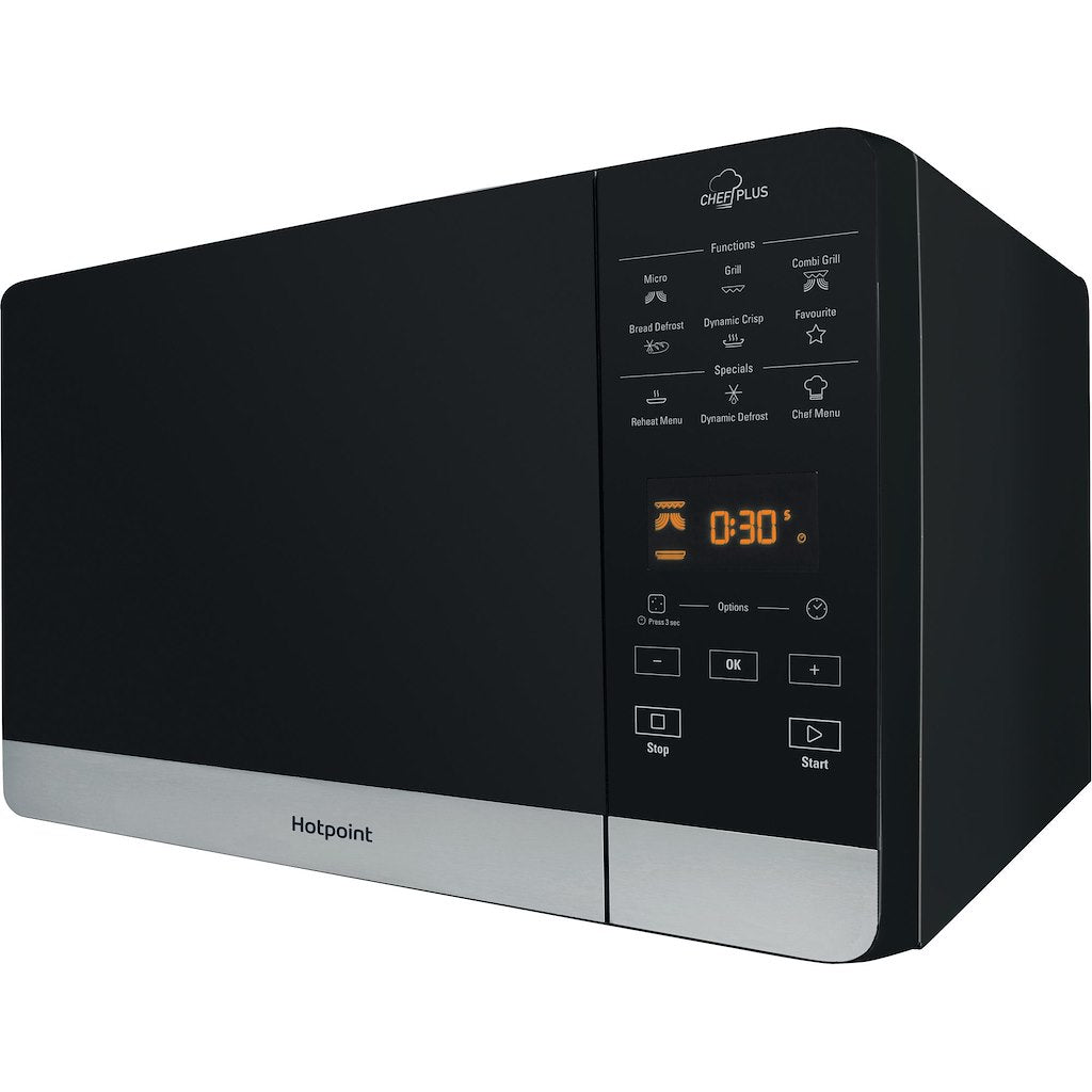 Discover a new way of microwave cooking with the Hotpoint Ultimate Collection MWH 2731B Combination Microwave in black.With Multiwave Technology food receives all around uniformed cooking and defrosting. Using two entry points for the microwaves to meet your food, the entire cavity is filled with power for thorough, even heating.Combined with features such as the full surface Quartz grill with self-cleaning function, and Dynamic Crisp to create the crunchiest pizza bases with succulent toppings – the Hotpoint Ultimate Collection MWH 2731B Combination Microwave creates your favourite meals in less time than conventional cooking methods.Operated via Touch Control, this appliance gives you 25L of capacity with up to 800w distributed across six power levels for tailored power when you need it.