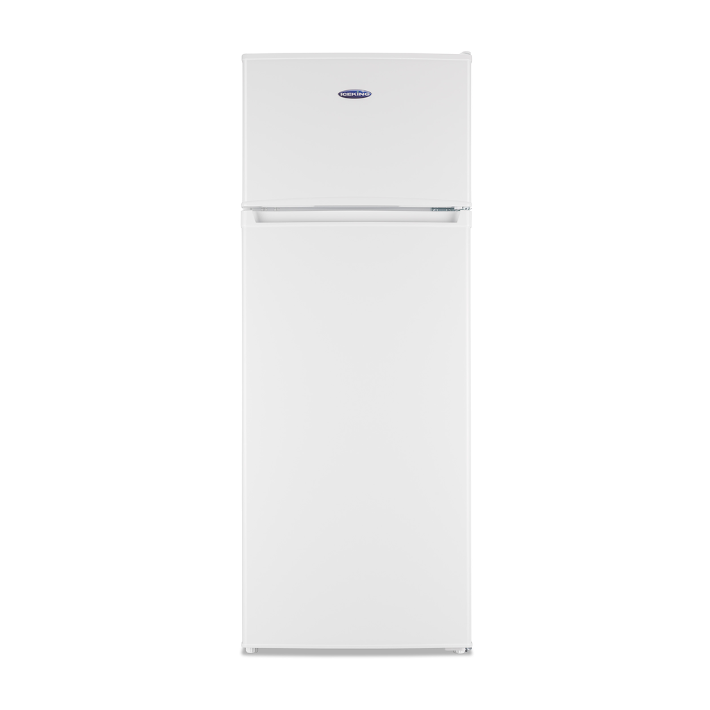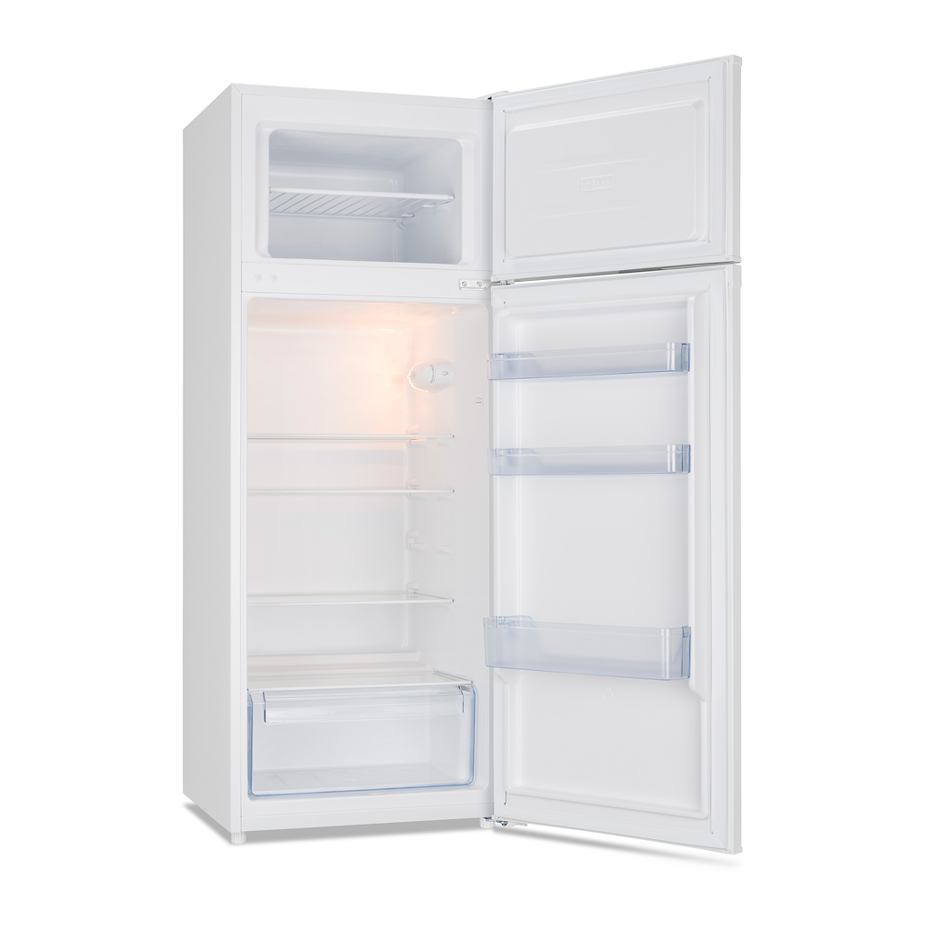 This spacious 169/37 litre top mount fridge freezer has 3 adjustable glass shelves and a salad crisper drawer to keep your fruit and veg fresh. It has balconies in the door with space for tall bottles, cartons and jars. The 4* freezer compartment provides room for well stacked frozen items. The energy rating from 1st March 2021 is E, in line with the new Energy Label Reform. Easy to use, with adjustable settings, an interior light and reversible doors, it's built with you in mind. Available in white, this model comes with a 2 year guarantee.