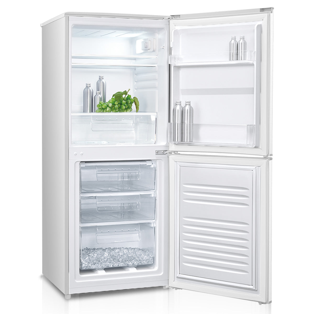 This spacious 215 litre fridge freezer has two adjustable glass shelves and a salad crisper drawer for your favourite food items. It also has balconies in the door for versatile storing of tall bottles, cartons and jars. The static freezer has a 4* rating and three drawers for storing frozen foods.
