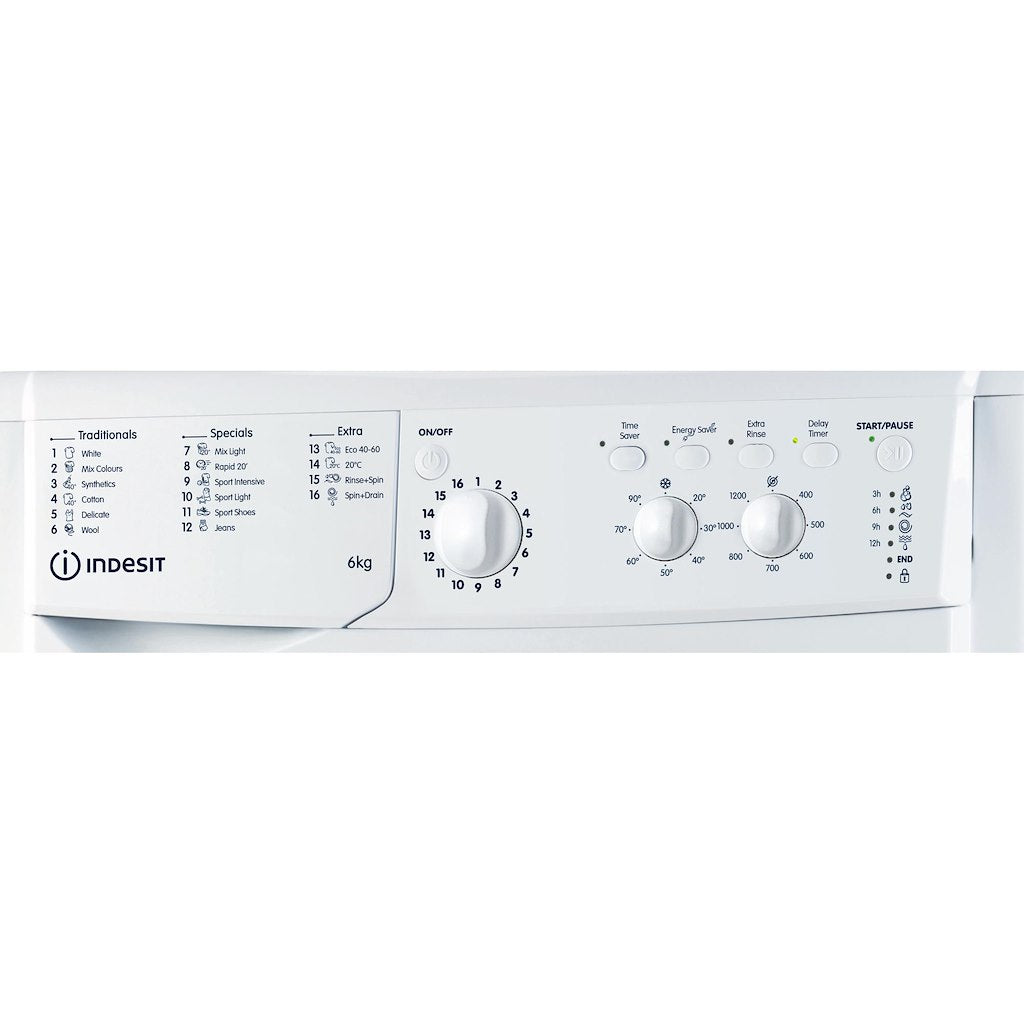 This Indesit freestanding front loading Washing Machine features: a spacious 6kg capacity. A fast, resource-efficient 1200 revolutions per minute spin speed. White colour.
