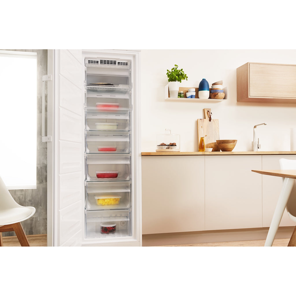 Ample space for all your essential food stuffs, the Indesit UI8 F1C W UK 1 Freezer in white combines low maintenance technology with fast freezing and clever organisation. Enjoy 260L of storage with five drawers to organise your favourite ingredients, store your bulk cooking. Thanks to Super Freeze Technology you can rapidly reduce the temperature within the freezer as new items are introduced which helps preserve food’s flavour and texture. Incorporating our Frost Free approach to home freezing, air flow is used to stop the formation of frost build-up which means less maintenance and more room to store food.