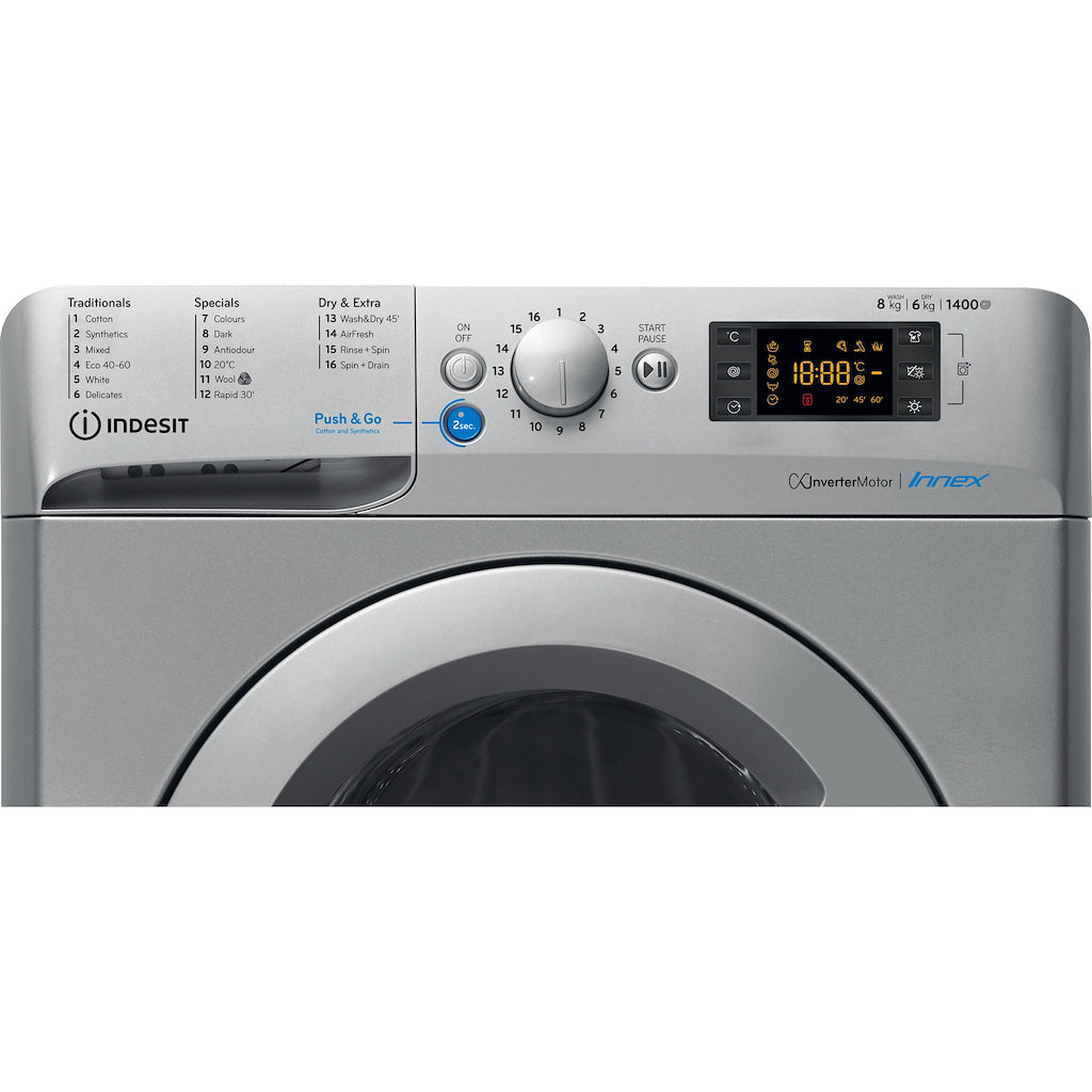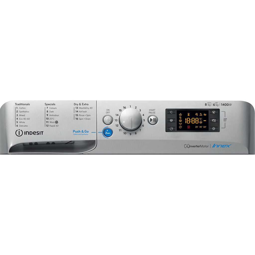 For a super-efficient approach to the day, the Indesit BDE 861483X S UK N Washer Dryer targets your hardest-working garments with dedicated wash cycles, while the variable dry cycles help keep your day on track. Featuring our innovative Push&Go programme, it only takes one push to achieve brilliant daily cleaning in just 45 minutes - no need to pre-treat or scrub, just press the dedicated button for two seconds and the Indesit washer dryer will automatically start a 30°c cycle that’s perfect for cotton and synthetics. Always working to save you money, Water Balance will adapt the amount of water used according to each cycle’s need. Ensuring there’s minimal wastage, it helps save money on your bills. Including a special Sports Cycle for your hard-wearing kits, this program respects the natural properties of fabrics such as Gortex, so even after a thorough wash your shorts, t-shirts, socks and jackets are ready for the next challenge. Going beyond the wash cycle, with Sensor Drying monitors the moisture and temperature levels inside the dryer so clothes and garments only get the heat they need. Protecting fibres from over-heating, it’s just one small way we’re helping to keep your day on track. Combining bespoke cycles such as Golden Woolmark to protect your knits, and Express Wash and Dry for when you’re in a hurry - the Indesit BDE 861483X S UK N Washer Dryer offers a completely practical approach to washing. With 8kg of capacity, 1400 rpm variable spin, an easy-to-use Digital Display and a Delay Timer for laundry that fits into your timetable, the Indesit BDE 861483X S UK N Washer Dryer not only has a self-clean cycle, but features have a Super Silent Motor so you’ve got a little more peace for those family moments.