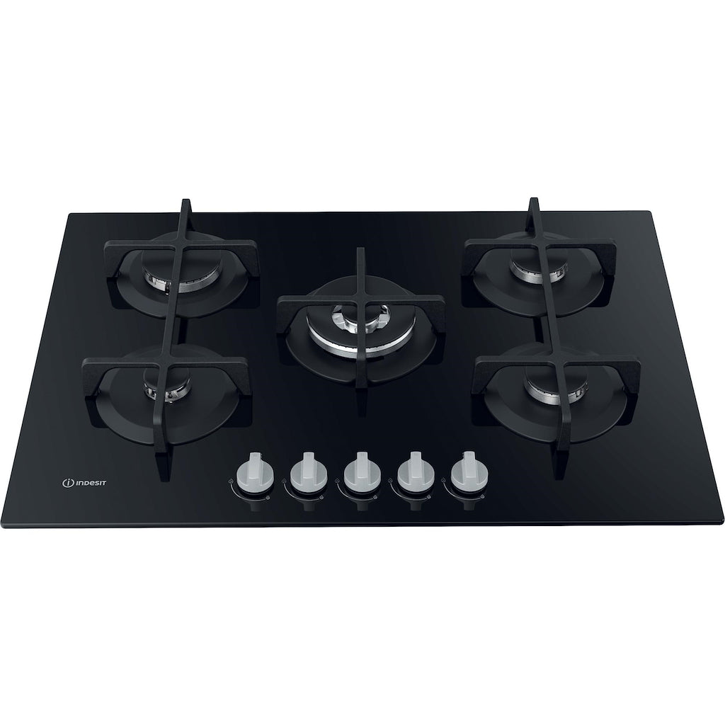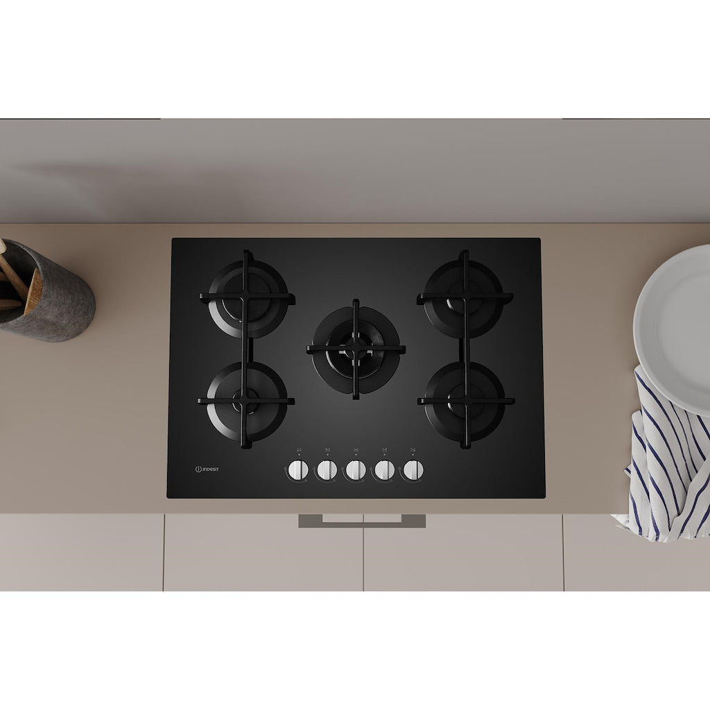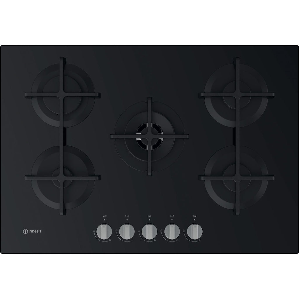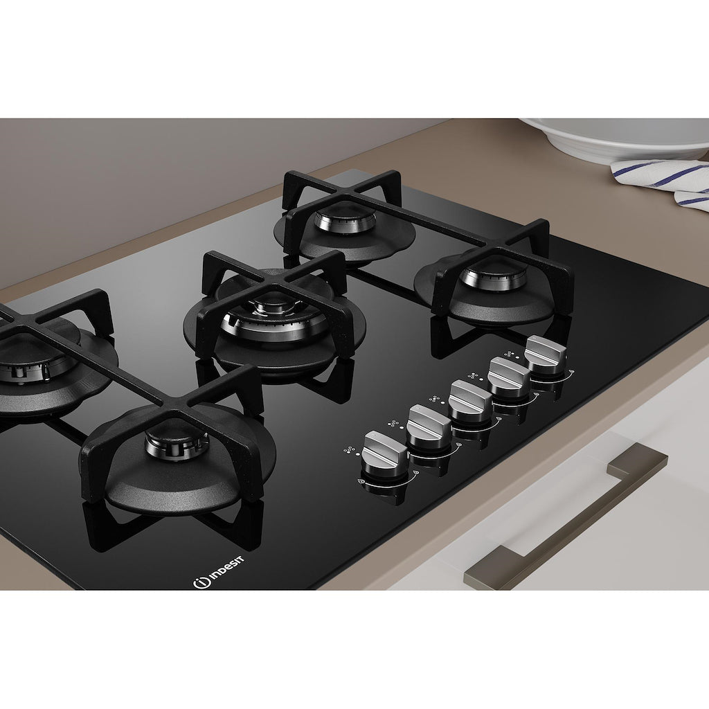 75CM Flame Control Gas on Glass Hob - Black - Cast Iron Supports - 5 Burners With Wok Burner and Flame Failure Device