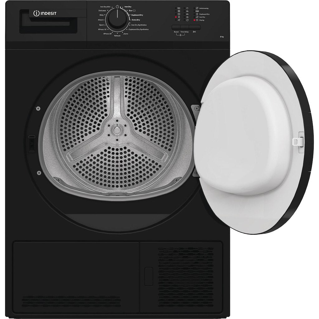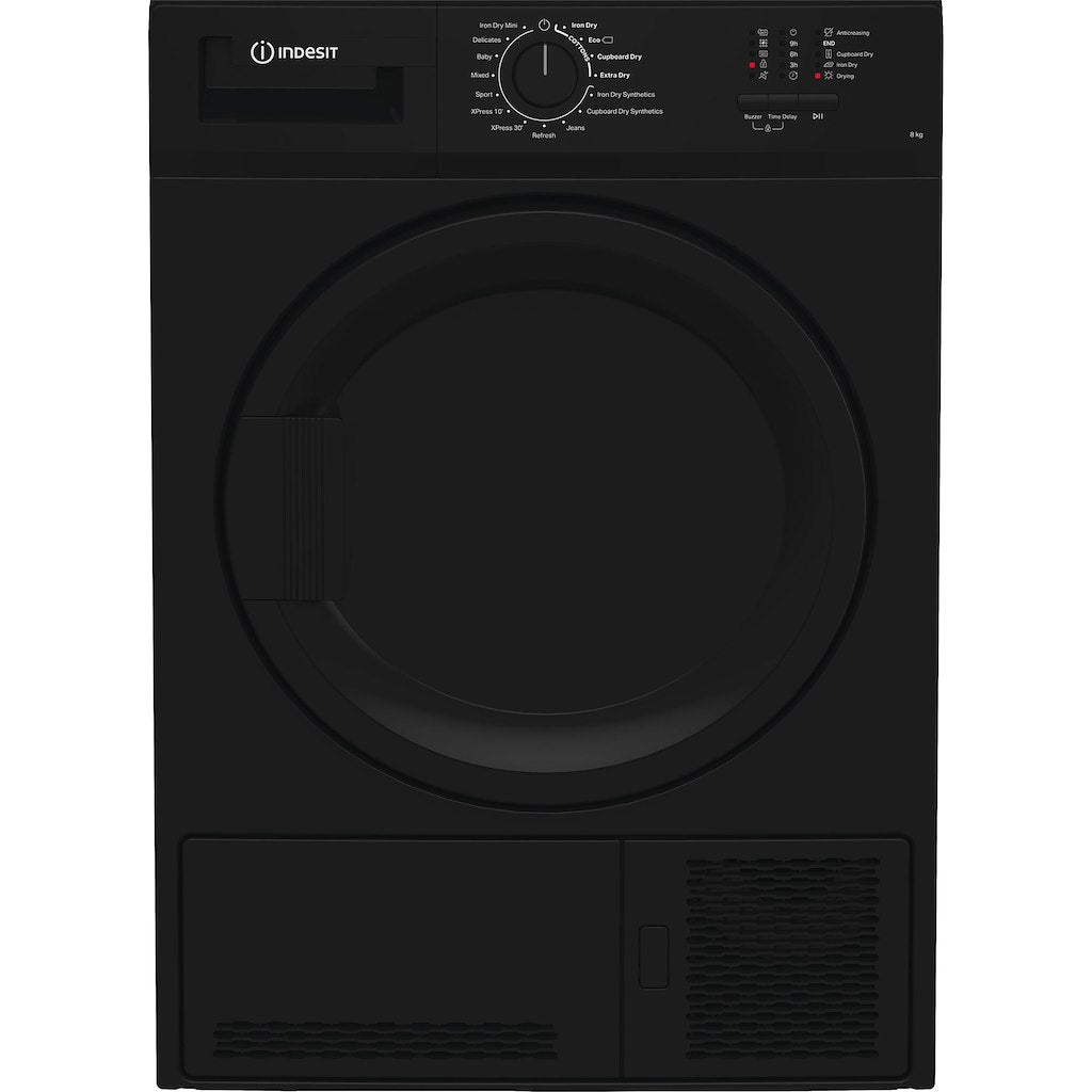 Indesit 8KG Condenser Dryer in Black, Energy Rating C. Comes with LED marker display and single control knob for selecting one of 15 cycles including 2 XPress cycles of 10 or 30 minutes and an easy iron option.