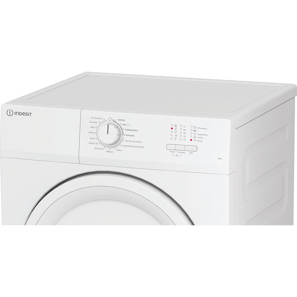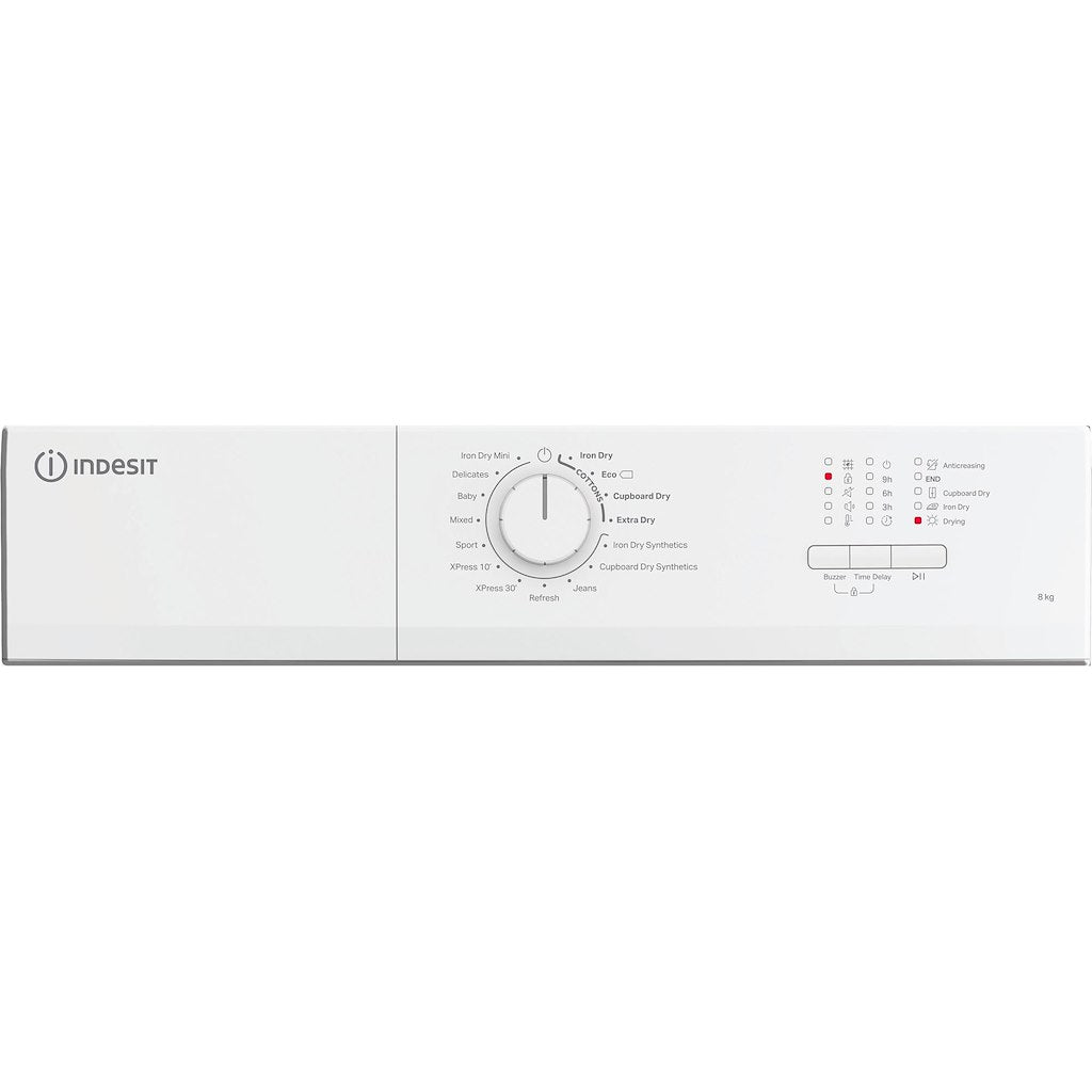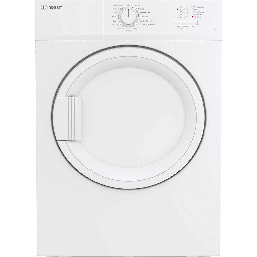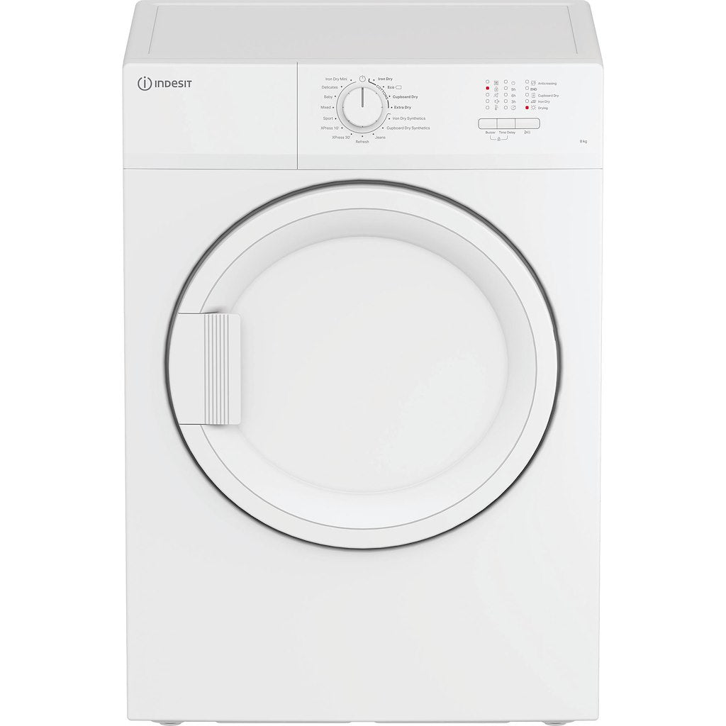 Indesit 8KG Vented Dryer in White, Energy Rating C. Comes with LED marker display and single control knob for selecting one of 15 cycles including 2 XPress cycles of 10 or 30 minutes and an easy iron option.