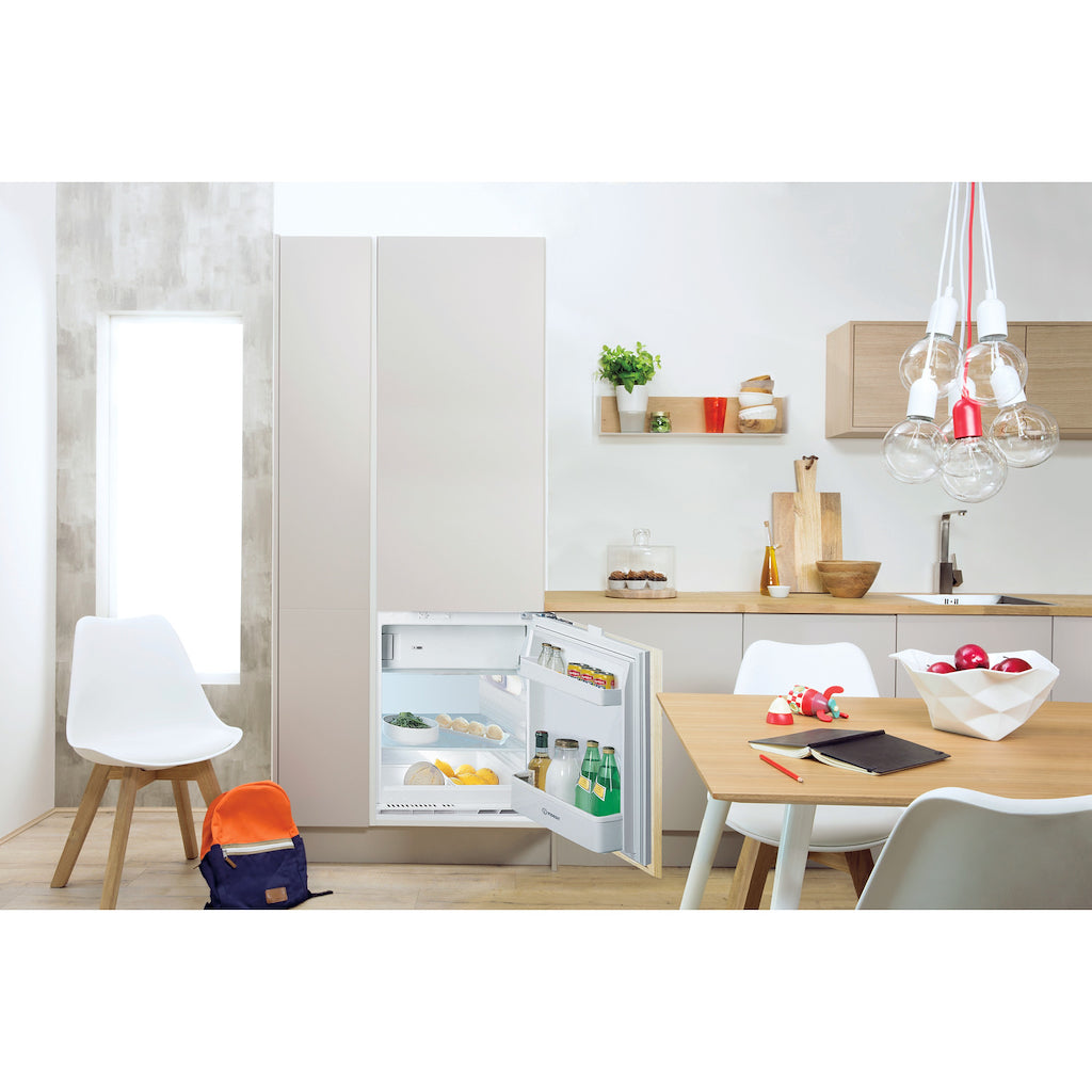 The perfect compact model for busy homes that need a modest amount of cooling storage, enjoy an easily integrated model with the Indesit IF A1.UK 1 Built-In Fridge in white. 126L of storage is distributed across two glass shelves for easy organisation, plus a dedicated salad crisper offers extra protection for delicate produce such as leaves and fruit. Complimented with an 18L Icebox compartment for you to store your essential freezer items. Easily controlled through the adjustable thermostat, with an A+ energy rating and reversible doors to make it a straight forward job to install into every kitchen, the Indesit IF A1.UK 1 Built-In Fridge is everything you need for great cooling.