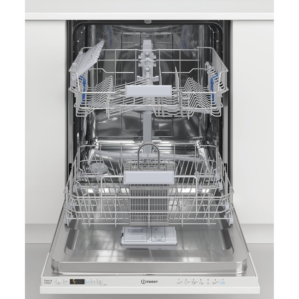 Taking the hassle out of enjoying brilliantly clean cups, crockery, cutlery and pans, the Indesit Built-In Slimline DIC 3B+16 UK Dishwasher combines super capacity with a choice of cycles, featuring Eco Cycle – the fastest eco cycle on the market, save time, water and energy whilst cleaning your pots, pans, crockery and cutlery to sparkling standards using only 11L of water. Perfect for saving money on your bills and respecting the planet’s resources. Clean up to 13 place settings in one go with a choice of six programs including Intensive, Delicates and Pre-Wash – get the results you love with a cycle to suit your timetable. Plus with a stainless steel tub and four stage filtration process, the Indesit Built-In Slimline DIC 3B+16 UK Dishwasher promotes brilliant hygiene and keeps food debris from reattaching to your crockery during the cycle. Easily operated through the LED display, let the Indesit Built-In DIC 3B+16 UK Dishwasher free your time for the more fun things in life.