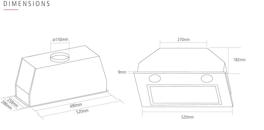 Stainless steel Caple Integrated hood BUCH, Caple hood has install dimensions of 52cm (width) x 18.2cm (height) x 28.6cm (depth) and an operating noise level of 52dB. The BUCH model also comes with and a manufacturer's warranty of 2 years for peace of mind.