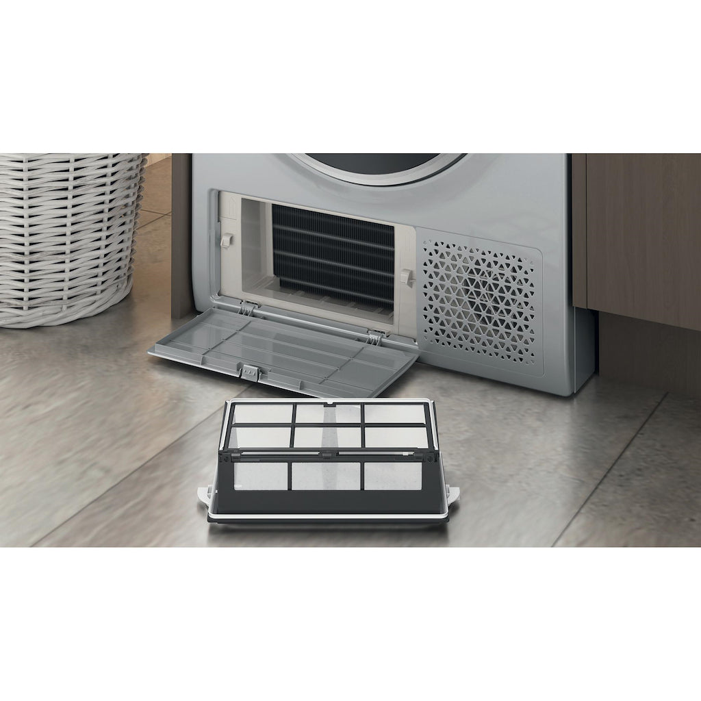 We have you covered for soft and crease-free laundry with the Hotpoint Crease Care 8kg NT M11 82SSK UK Heat Pump Tumble Dryer that has an A++ energy rating. Crease Care saves more than 50%* in energy consumption and helps protect your laundry from creases, gently tumbling clothing for up to 10 hours once the cycle has ended, keeping them soft and smelling fresh for when you can't unload the dryer immediately. Our Anti-allergy cycle offers a helping hand for those with allergies or sensitive skin, providing a thoughtful solution that removes 99.9%** of dust mites from laundry. The silver colourway adds a warm statement to any interior and combines a family-sized 8kg capacity with thoughtful technologies carefully crafted with convenience and functionality. *Comparing the annual energy consumption of a Hotpoint A++ heat pump tumble dryer versus a Hotpoint B class condenser dryer. **Tested by Allergy UK.