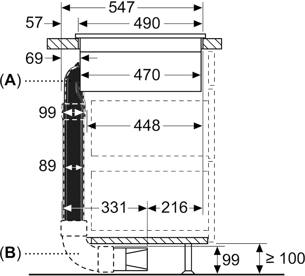 - - No false floor is necessary below the cooktop with integrated downdraft ventilation system. The drawers and/or shelves in the floor unit must be removable. The backpanel of the floor unit can be kept - only a cut-out for the air outlet is needed (position and size can be taken from the installation instructions).