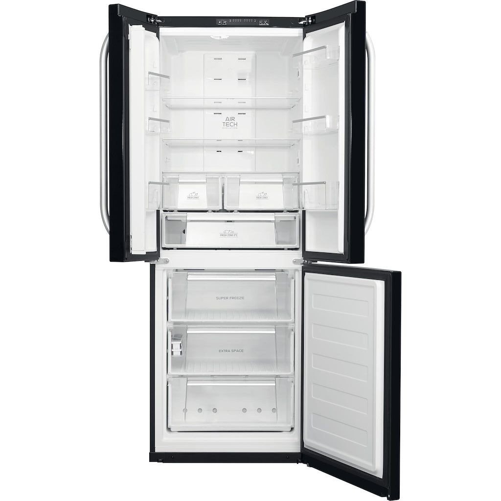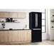 This Hotpoint freestanding Fridge Freezer features: a tall appliance to fit your family needs. Black colour. No frost, frost free technology, that effectively prevents ice build-up in your appliance, by reducing humidity levels. Glass shelves with profile fronts, providing robustness and extra safety. A fan that provides a smooth and even flow of air in your appliance's cavity, for enhanced ventilation.