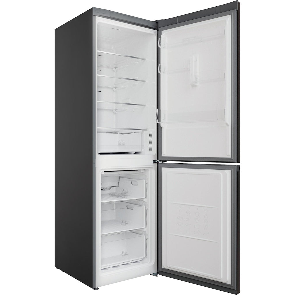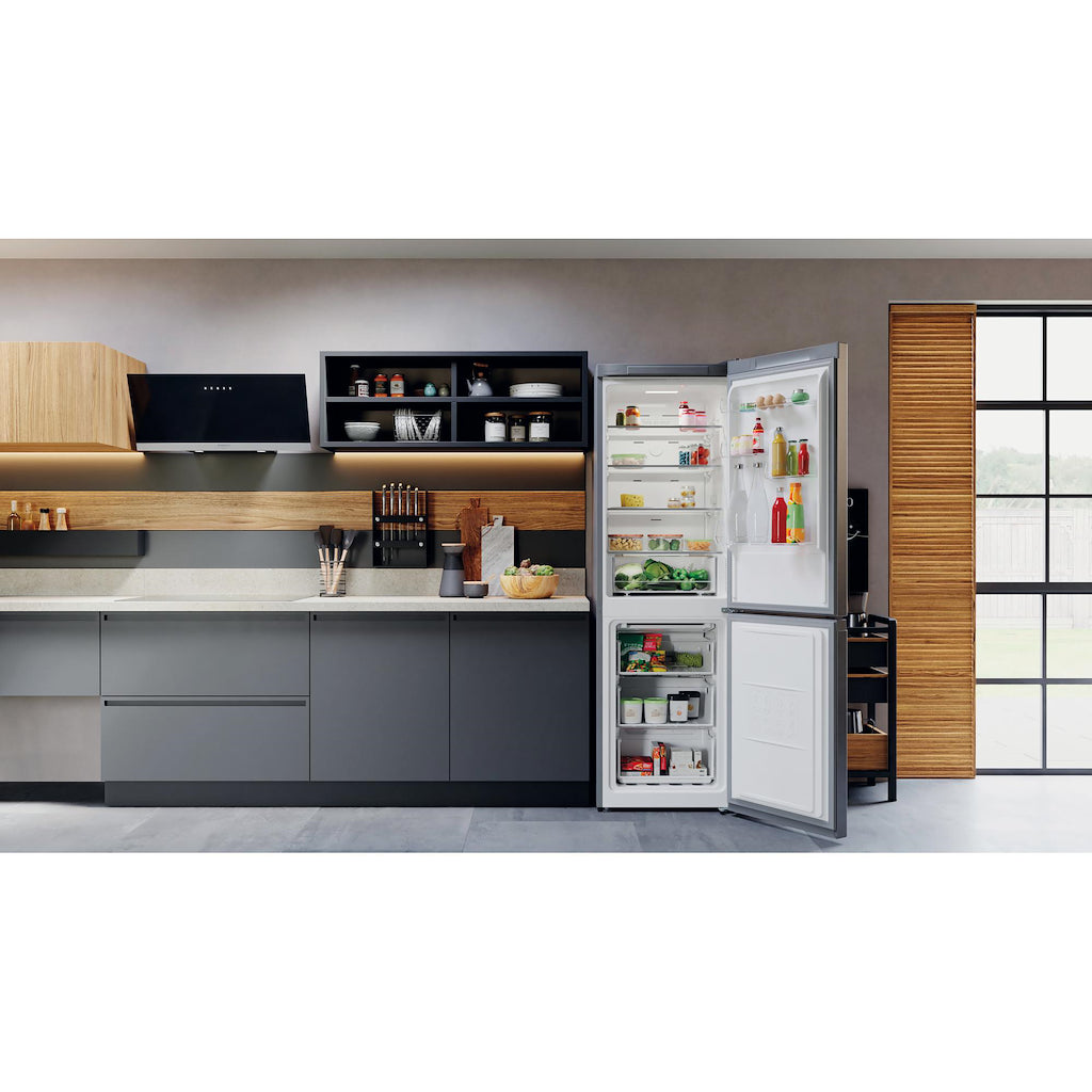 The freestanding Hotpoint H5X 82O SX fridge freezer in satin stainless steel is full of thoughtful technology that helps to keep your food fresh. Our Total No Frost technology means you never have to defrost your appliance again, as no ice or moisture can build up in the fridge or freezer, meaning no soggy salads either. The Active Fresh function helps you to prevent food waste by ensuring the ideal temperature levels for longer food preservation. Furthermore, this Hotpoint fridge freezer maintains the correct temperature inside your fridge and freezer along with a dedicated Fresh Zone drawer that cares for your salads and vegetables.