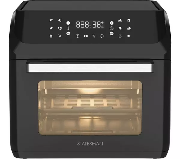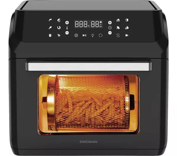 Prepare a huge variety of meals for the whole family with this 15 Litre 13-in-1 Digital Air Fryer Oven from Statesman, which uses less oil and has lower energy consumption than a conventional oven. Energy-efficient, 360° air circulation results in faster and more even cooking, whether you’re preparing perfectly crispy chips using the rotating basket, grilling succulent kebabs using the 8-piece skewer set, or even roasting Sunday’s joint using the rotisserie fork and spit. There’s also the choice of using 2 grill racks and a baking tray for more traditional oven-style cooking. Let the Air Fryer take care of the hard work with a choice of 12 pre-set cooking programmes including pizza, cake, bread, dehydrate and reheat, so you can be sure that whatever’s on the menu will be cooked to perfection. With the clear viewing window and interior light, you can easily check on the cooking process without having to open the door. Once the meal is over, cleaning up is as simple as possible with the non-stick, dishwasher-safe accessories and detachable door.