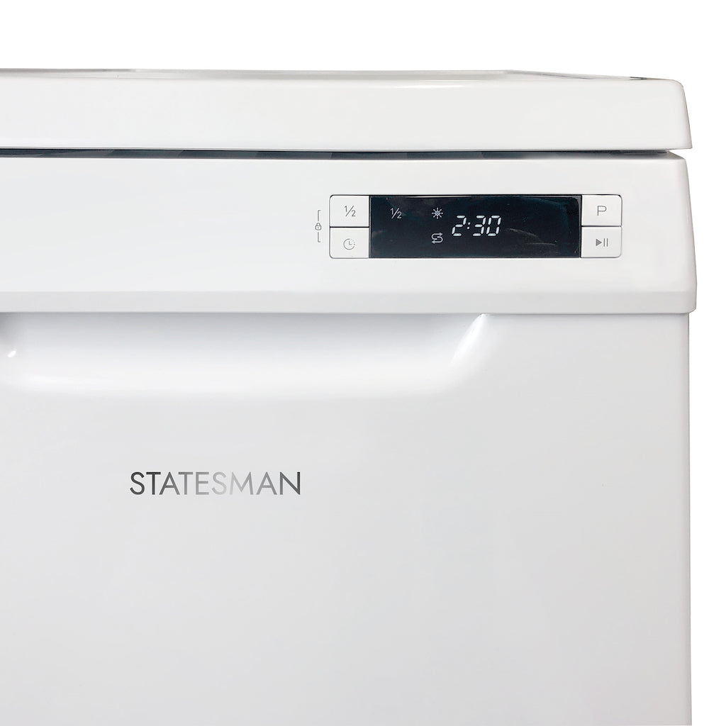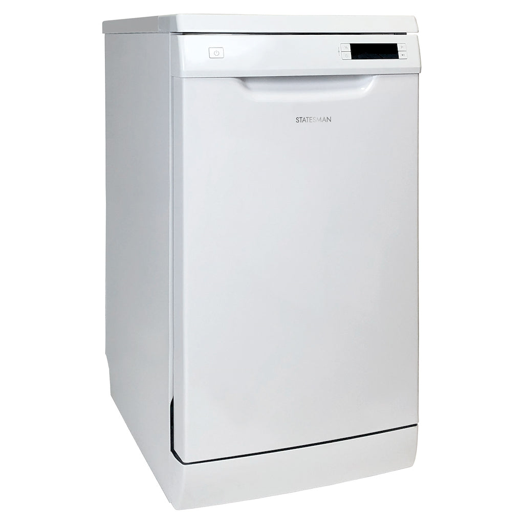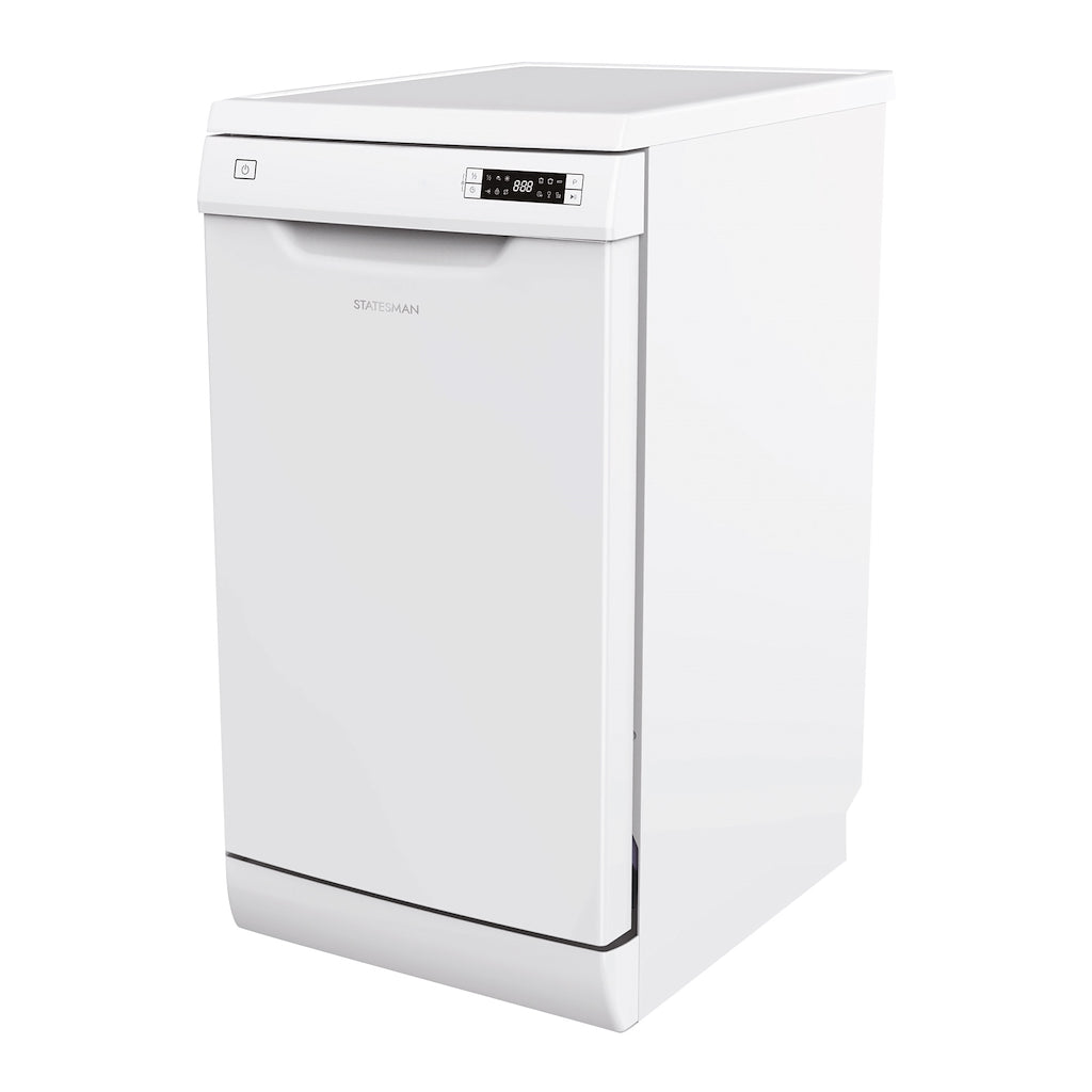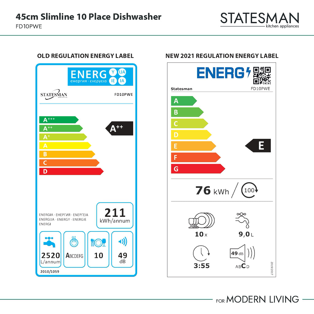 Statesman FD10PWE 45cm Slimline 10 Place Dishwasher comes with a comfortable 2 year parts & labour guarantee, 10 place settings, 6 wash programs (All in One 50ºC, Intensive 60ºC, ECO 45ºC, 90 Min 65ºC, Glass 60ºC and Soak), a half-load wash, program indicator, water softness adjustment, cold water fill - Water Consumption: 9 Litre and Energy Consumption (kWh/Cycle): 0.69