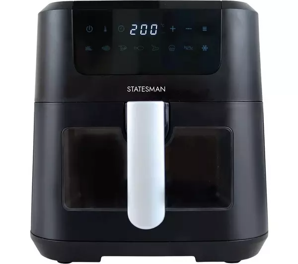 Cook deliciously crispy chips, roast healthy vegetables, and even bake cookies using less oil with Statesman’s 5 Litre Air Fryer. 360° air circulation results in faster and more even cooking, meaning your family can easily enjoy their favourite foods whilst keeping energy costs lower than a conventional oven. The smart-looking digital LED display keeps operation simple, with clear touch controls and 8 pre-set functions to keep mealtimes as stress-free as possible. The square basket shape not only looks the part, it also allows a greater surface area than round baskets, meaning your food will cook quicker and more evenly. A clear viewing window and interior light enable you to easily check on the cooking process without having to open the drawer and allow precious heat to escape. Designed for convenience, the non-stick, dishwasher-safe basket and accessories mean you can spend less time cleaning and more time enjoying the delicious dishes you’ve prepared.