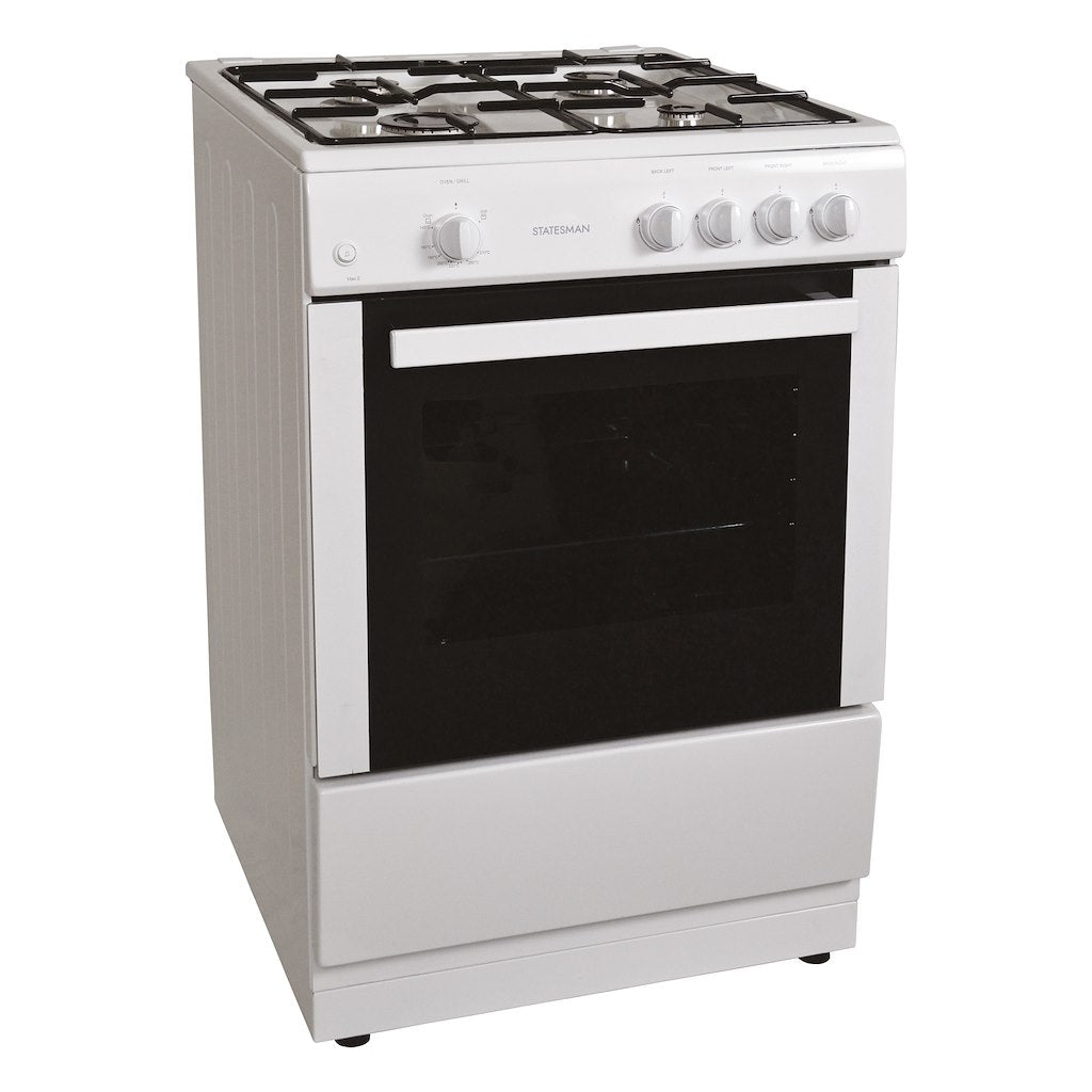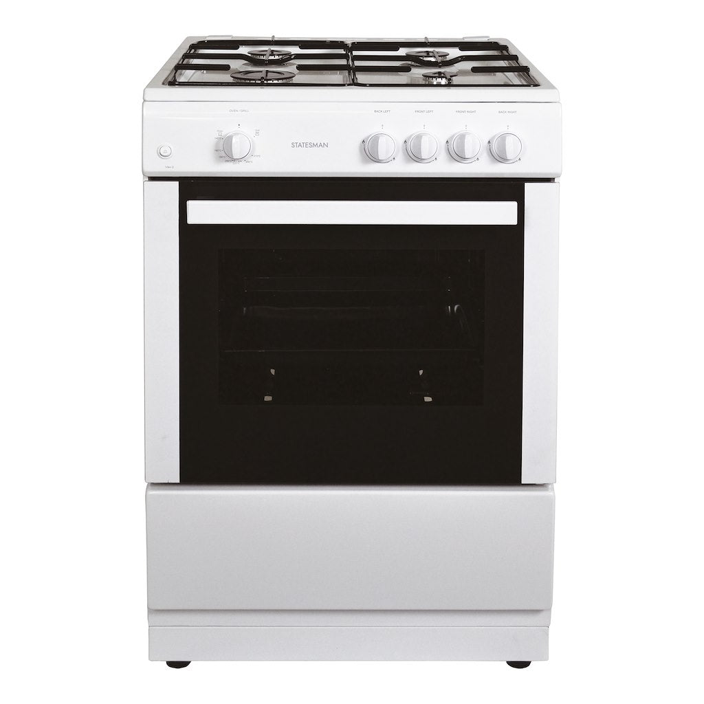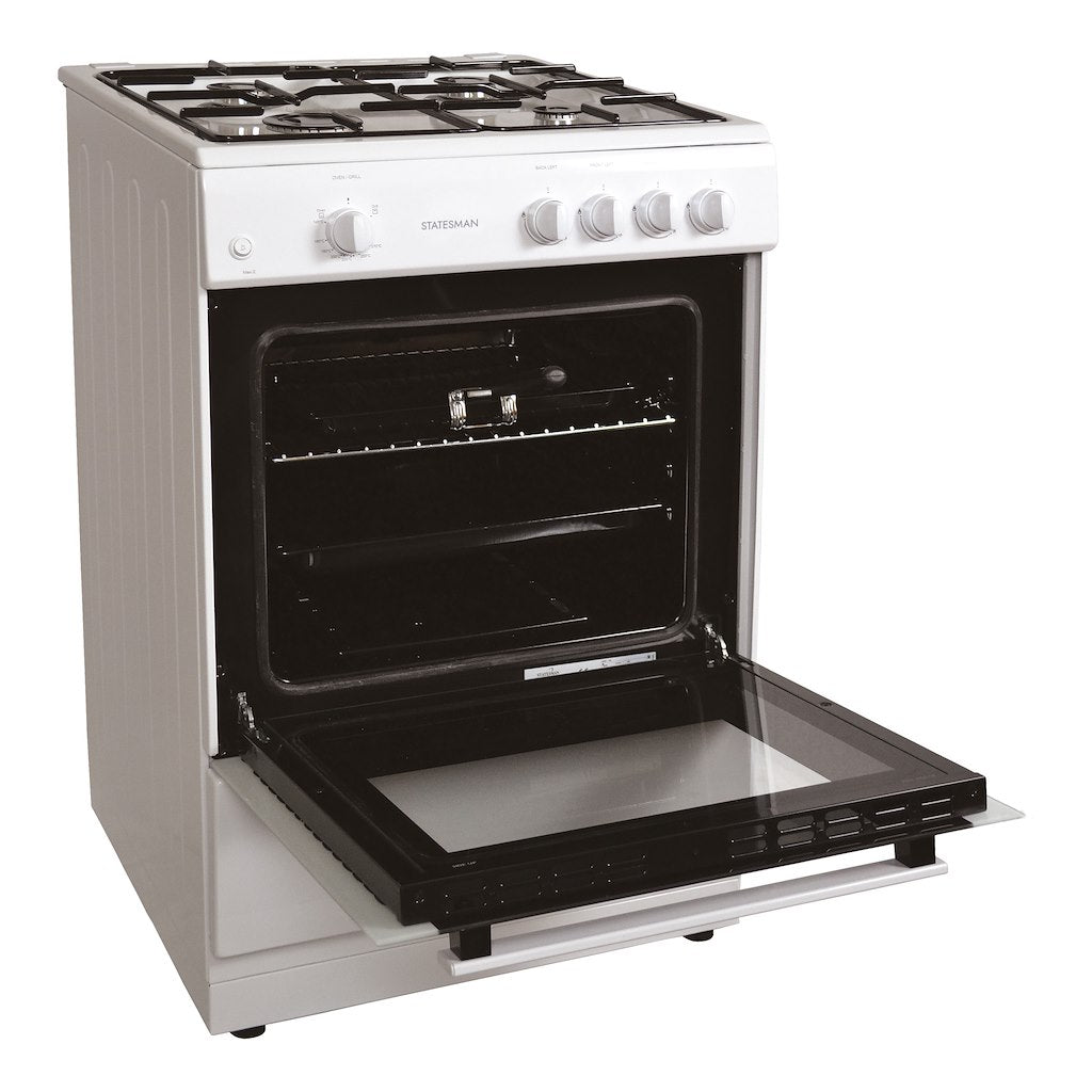 White Statesman Free Standing Gas cooker MAXI60GSF. This A energy rated model comes with a 61 litres capacity. This Statesman cooker has install dimensions of 60cm (width) x 90cm (height) x 60cm (depth). The MAXI60GSF model also comes with 4 number of burning zones, 1 cavity, Fixed Grill, Fixed control panel, and a manufacturer's warranty of 2 years for peace of mind.