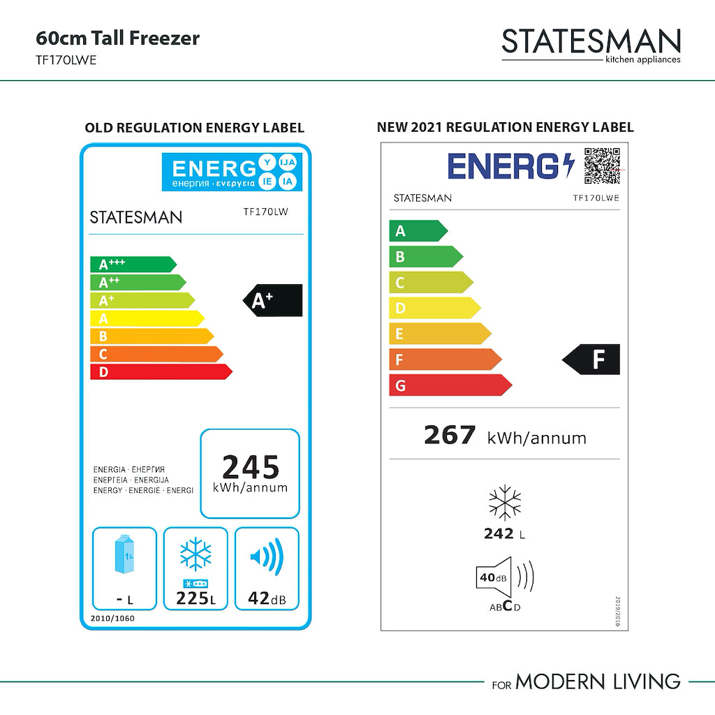 White Statesman Free-standing Freezer TF170LW. This F energy rated model comes with 225 litres freezer net capacity. This Statesman freezer has install dimensions of 60cm (width) x 170cm (height) x 60cm (depth) and an operating noise level of 42dB. The TF170LW model also comes with 7 number of drawers; light; reversible door hinges; temperature adjustable freezer; and a manufacturer's warranty of 2 years for peace of mind.