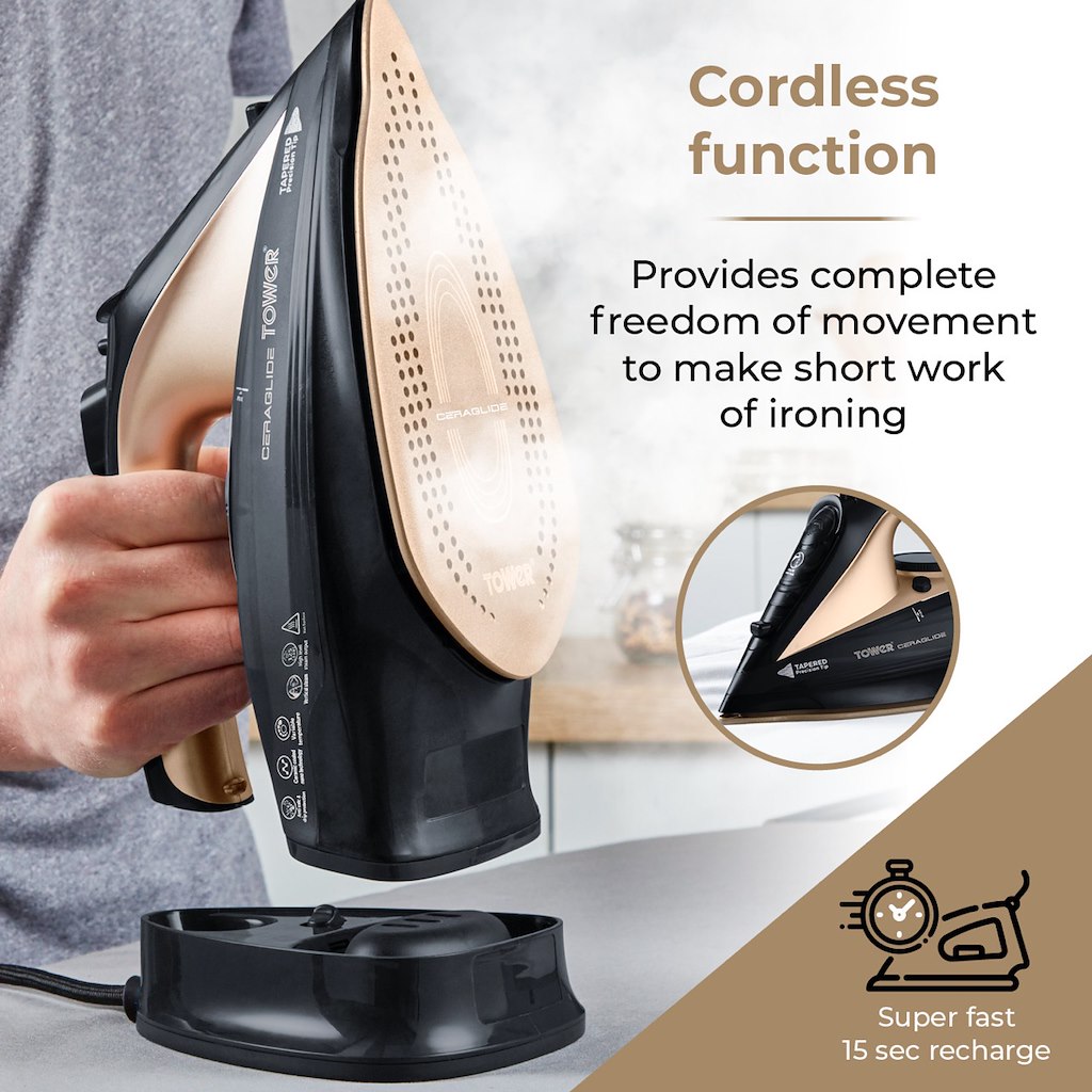 This 2-in-1 Tower CeraGlide steam iron provides you with the choice to use it either corded or cordless for ultimate versatility. Featuring a powerful performance thanks to its 2400W output, this iron heats up in less than 30 seconds and provides a 40g/minute steam output and a 180g/minute steam shot to target and eliminate stubborn creases. The CeraGlide multi-layered ceramic soleplate effortlessly glides over a range of fabrics to gently iron out wrinkles. A 360ml water tank provides enough capacity to tackle large ironing tasks without the need to constantly refill. Featuring anti-drip during low temperature operation, an anti-calc function to prevent limescale build-up and a self-cleaning setting for hassle-free maintenance, this steam generator iron has the essential tools to ensure a long lifespan. Comes complete with a measuring cup for ease of refilling at any time, while the soft touch handle provides comfortable control.