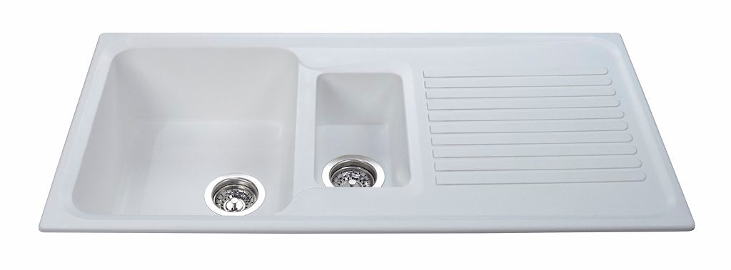 The CDA AS2WH is a one and a half bowl composite sink in white. It is scratch, stain and heat resistant to withstand tough use in the kitchen and its finish and design are both elegant and sleek, complementing your modern kitchen perfectly.