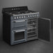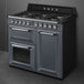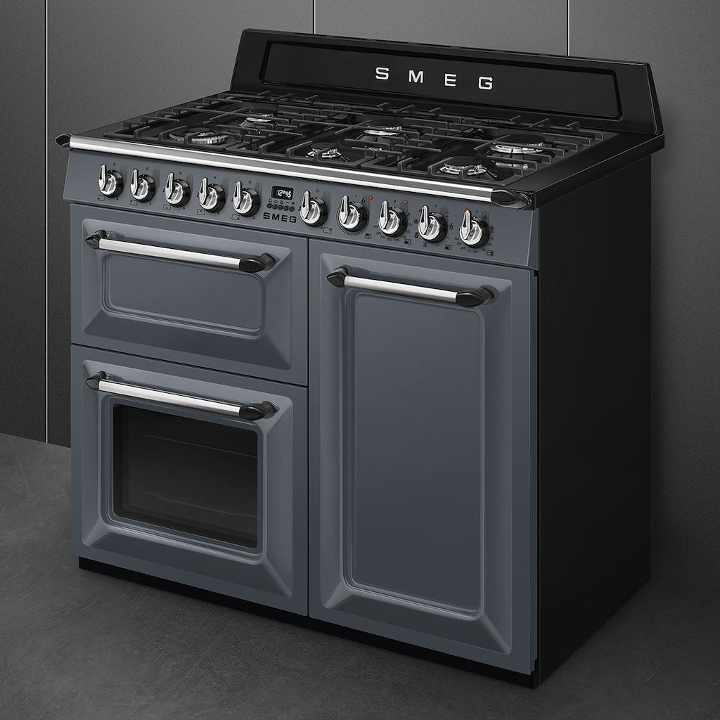 Grey Smeg Dual fuel Range Cooker TR10GR, this AB energy rated model comes equipped with 181 litres capacity, 10 number of cooking programmes, 6 number of burners and 3 number of cavities.This Smeg range cooker has install dimensions of 100cm (width) x 90cm (height) x 60cm (depth). The TR103GR model also comes with wok burner, electronic timer, Buttons/dial control panel and a manufacturer's warranty of 2 years for peace of mind.