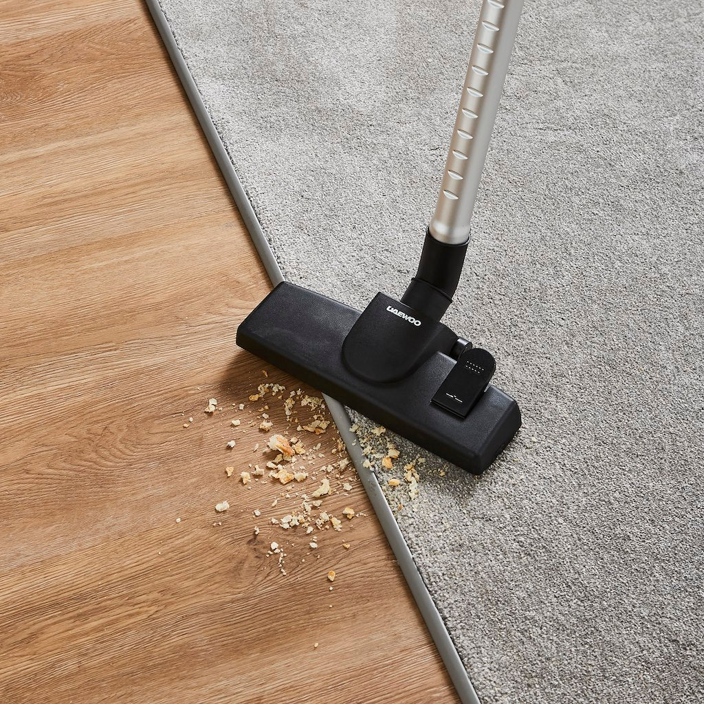 The vacuum cleaner has a powerful 600W motor with Cyclonic suction technology that effortlessly collects dust and debris. It comes with a foot toggle to optimize performance on carpets and hard floors. The vacuum has a convenient 0.8L dust tank that can be easily emptied by pressing a button. It also has a washable HEPA filter that removes the finest allergens and debris, resulting in a cleaner household. The 2 in 1 crevice and upholstery brush makes it easier to reach difficult areas, such as stairs, sofas, corners, and curtains.