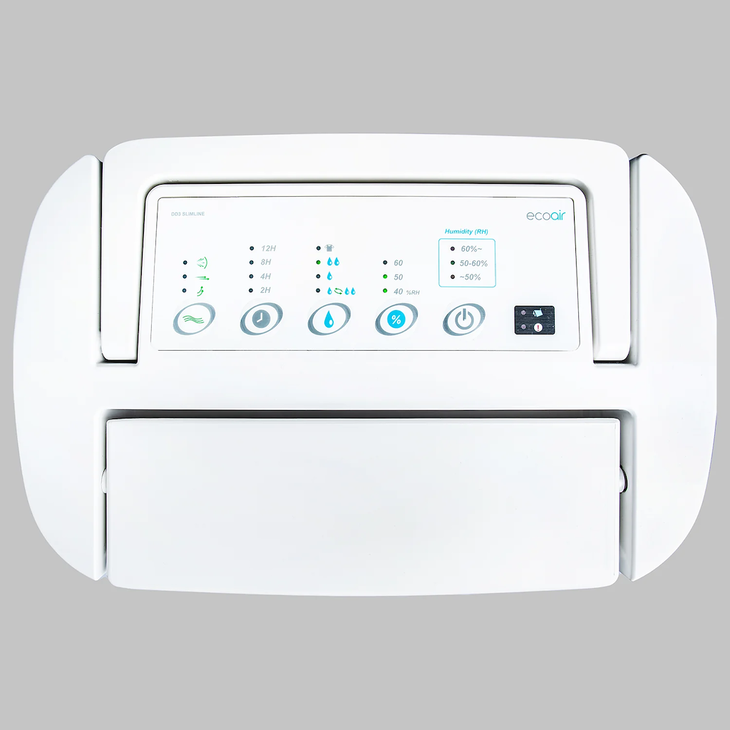 DD3 Slimline extracts up to 10 litres per day at all temperature from 1°C to 40°C and is ideal for use all year round. Perfect for garages, boats, cellars, office, home and basements. It is ideal for use in a 2 to 5 bedrooms home up to 85 m² with persistent damp issues, is super lightweight at only 6.8 KG with an impressive low noise dBA. This dehumidifier is ideal for winter use as it expels air that is slightly warmer than the ambient air which helps to heat the space. With a dehumidifier the air is easier to heat as well and can save on your energy bill. Electronic Control Panel  Clear and easy to use Digital Control Panel - Timer functionality, Laundry Mode and Auto-Restart designed to make dehumidifying easy.Restart designed to make dehumidifying easy. Humidity Indicator - The Room Humid. (RH) indicator shows the ambient humidity level. 65% & Above, 50-65% and 50% or less. Washable Antibacterial Silver Filter - The Antibacterial Nano Silver Filter kills airborne bacteria on contact. Clean the filter using a soft brush or gently vacuum every 2 weeks to maintain clean air and longevity of your dehumidifier. You should replace the filter at least once every 6 months for optimal performance and hygiene standards. Laundry Mode - A powerful laundry function to help you dry laundry indoors. When pressed, the DD3 Slimline will run on full power continuously until you change your settings.